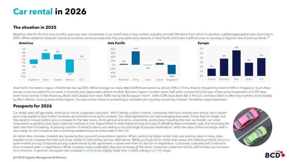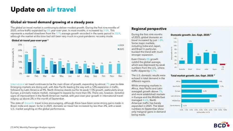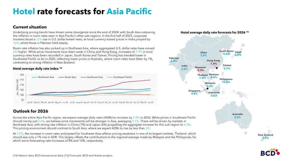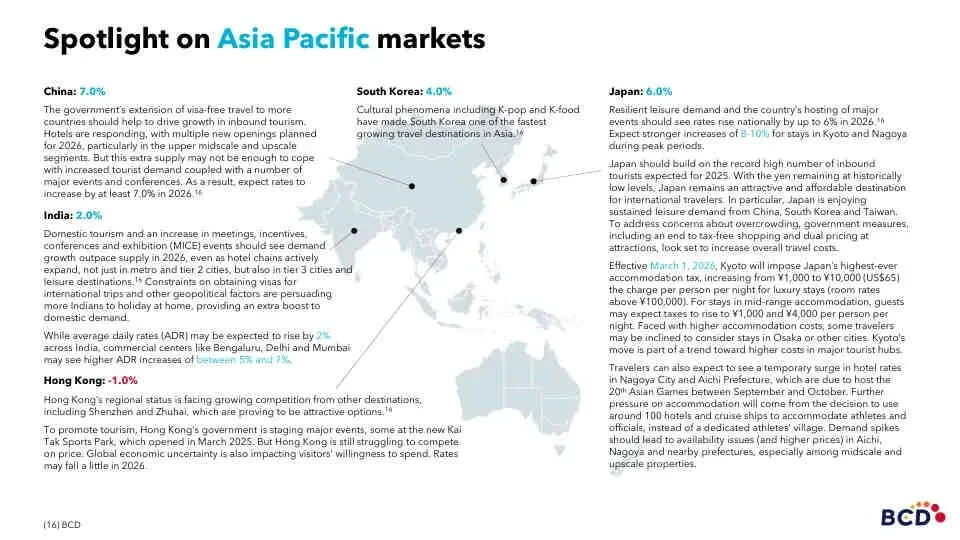 - 亚洲:+5.1%(中国+7.0%,受益于免签政策和大型会展;日本+6.0%,游客激增;泰国仅+1.0%,供应过剩)。
