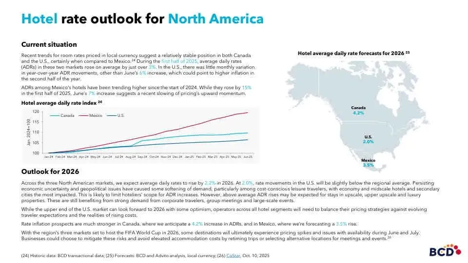 | 1. 大型活动干扰 | 2026年美加墨世界杯(6–7月)将导致16个主办城市酒店爆满、交通拥堵、价格飙升;其他国际峰会、展会也会造成局部干扰。 | 提前规划行程,避开高峰;考虑替代城市或远程参会。 |
