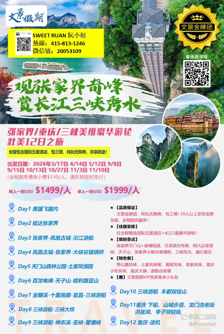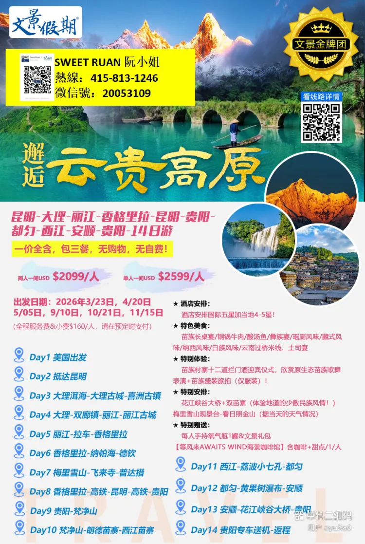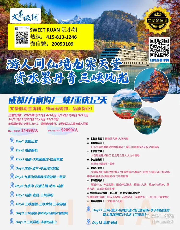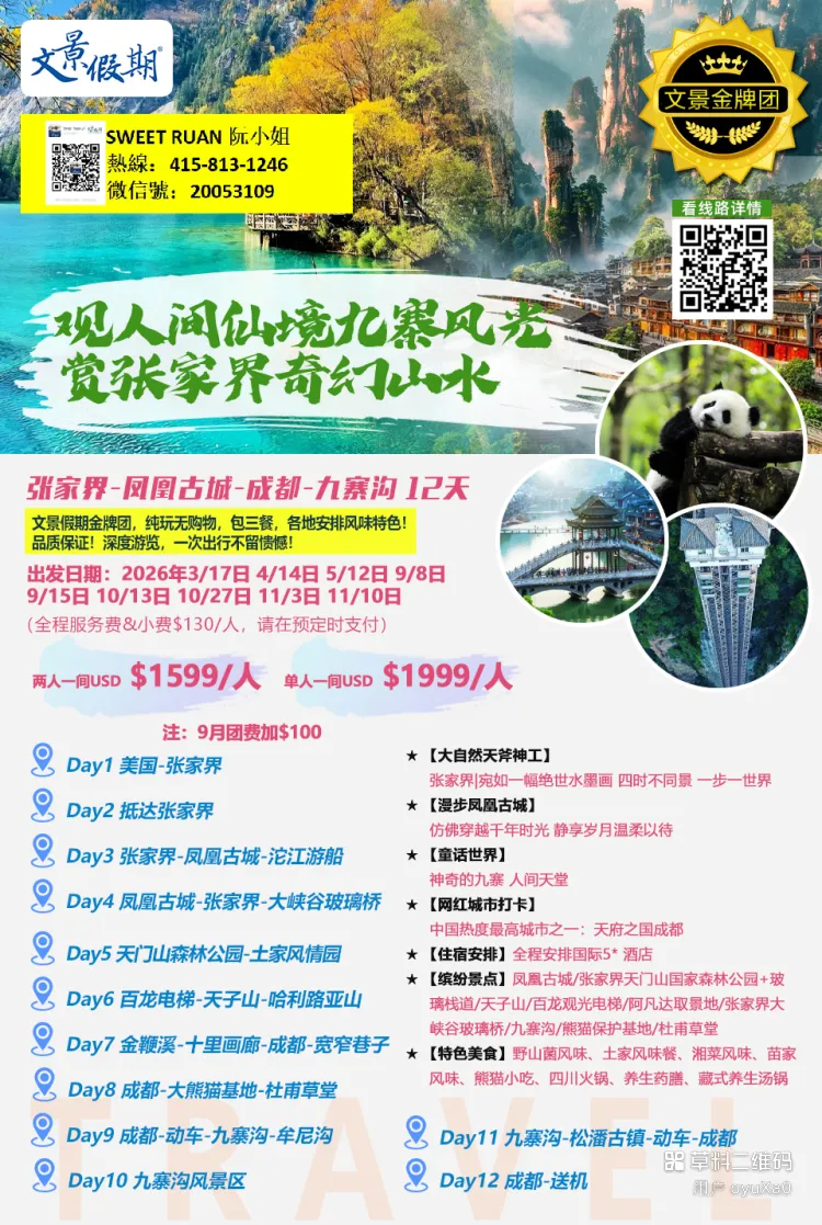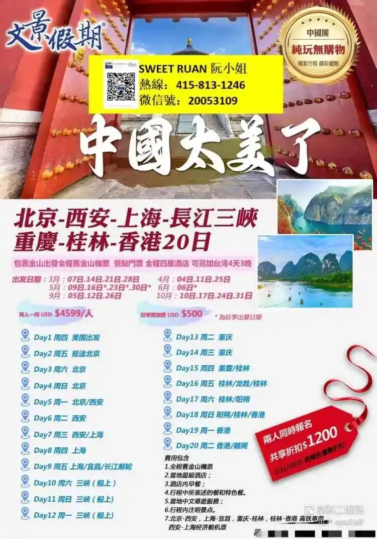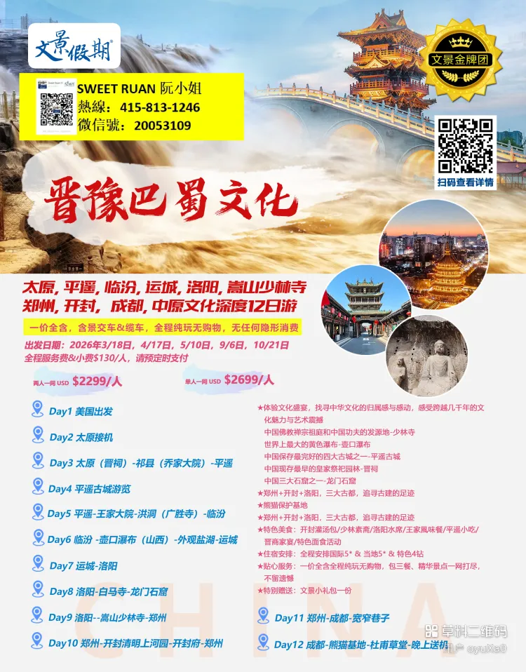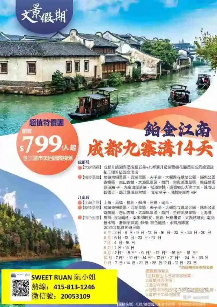 ![]() | 歡迎來諮詢詳細信息。 如果有需要“請聯繫” 文景假期旅遊顧問 Sweet Ruan 阮小姐 美國1-415-813-1246 請掃描左側獲取更多 微信號:20053109 |
