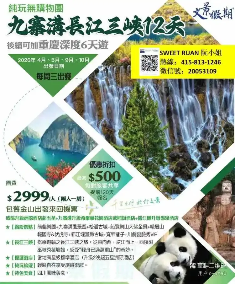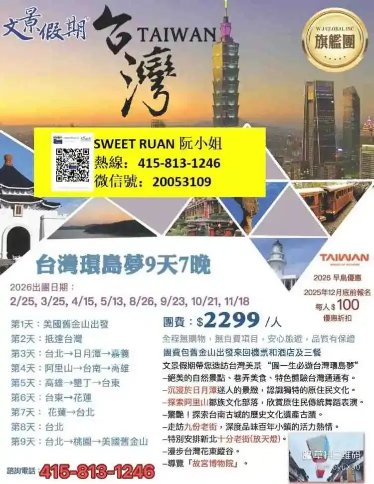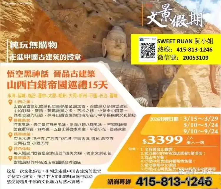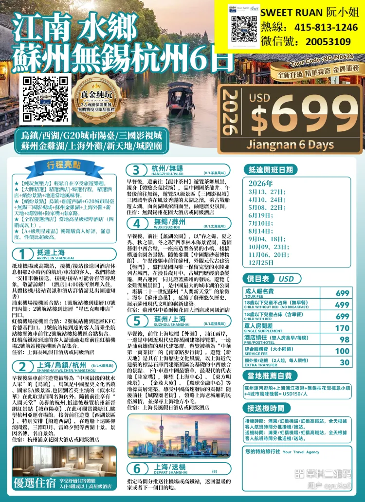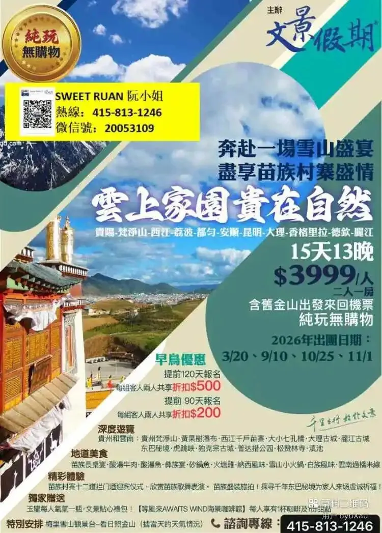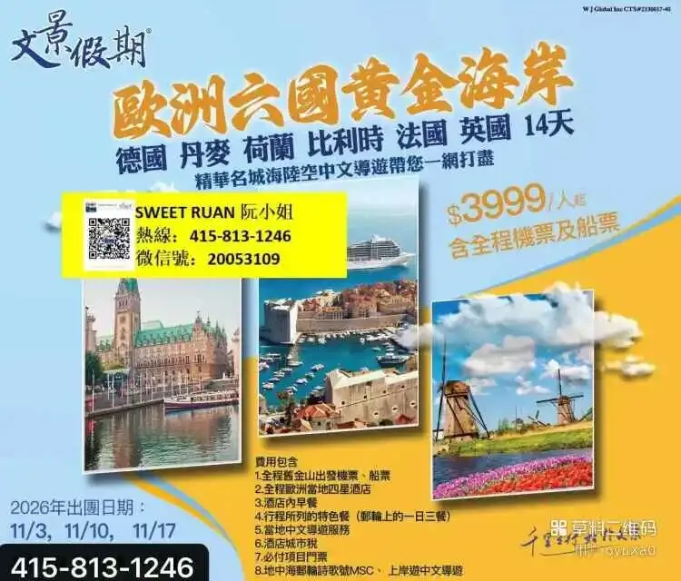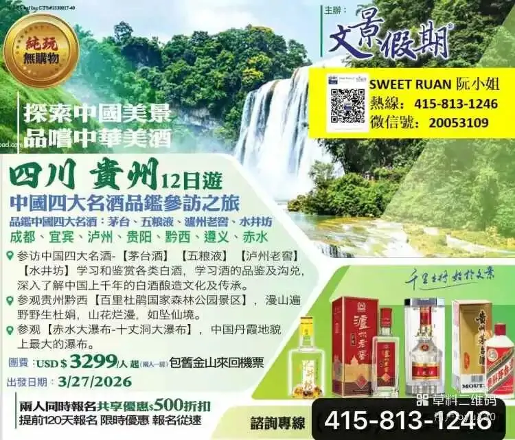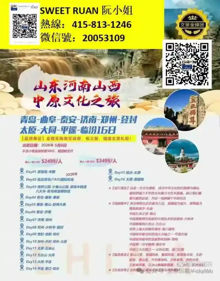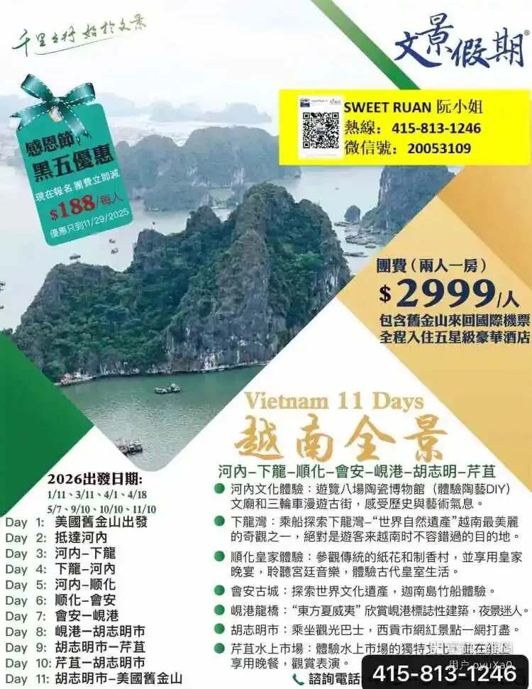 ![]() | 歡迎來諮詢詳細信息。 如果有需要“請聯繫” 文景假期旅遊顧問 Sweet Ruan 阮小姐 美國1-415-813-1246 請掃描左側獲取更多 微信號:20053109 |