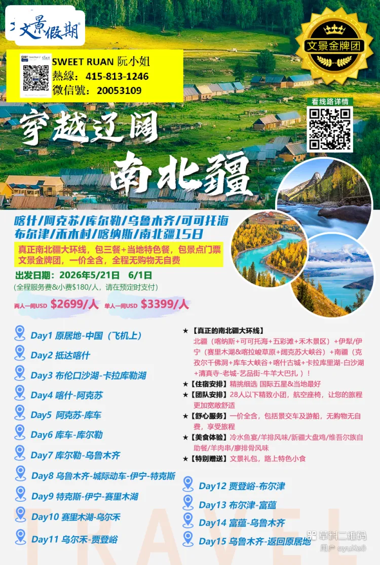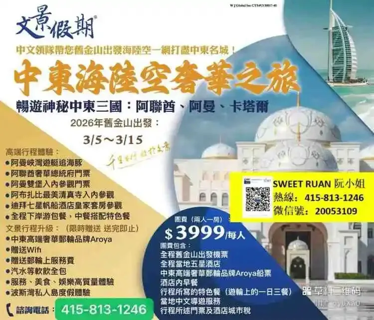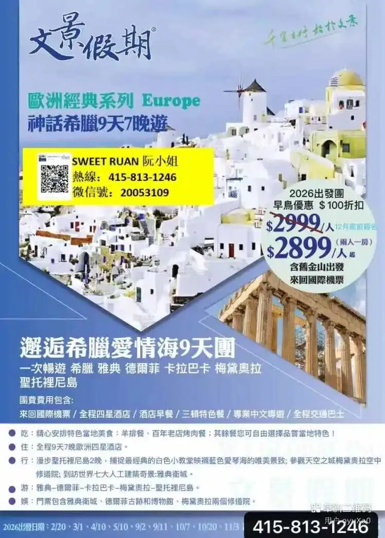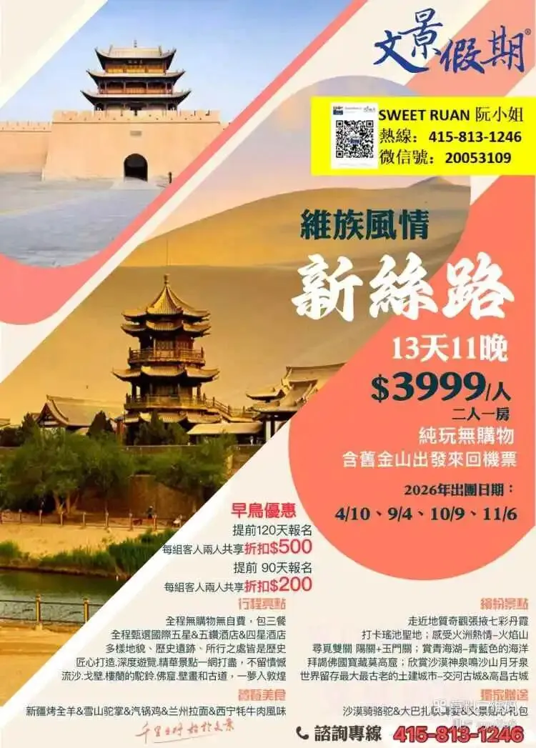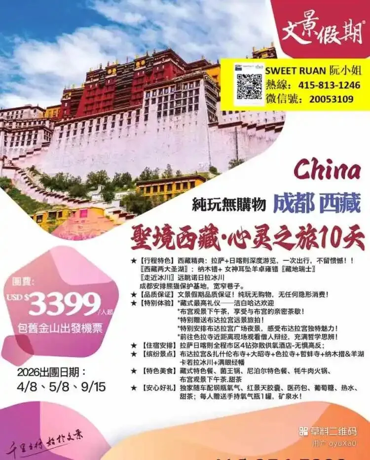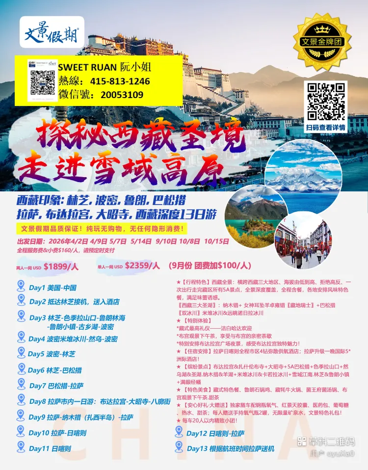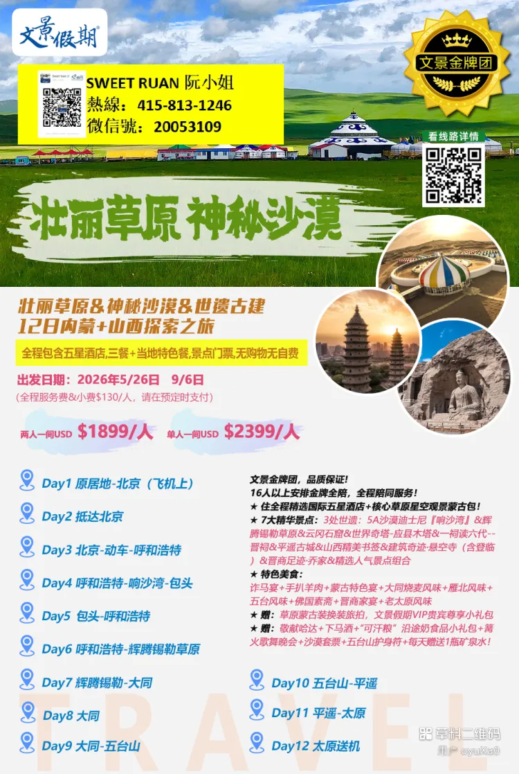 ![]() | 歡迎來諮詢詳細信息。 如果有需要“請聯繫” 文景假期旅遊顧問 Sweet Ruan 阮小姐 美國1-415-813-1246 請掃描左側獲取更多 微信號:20053109 |