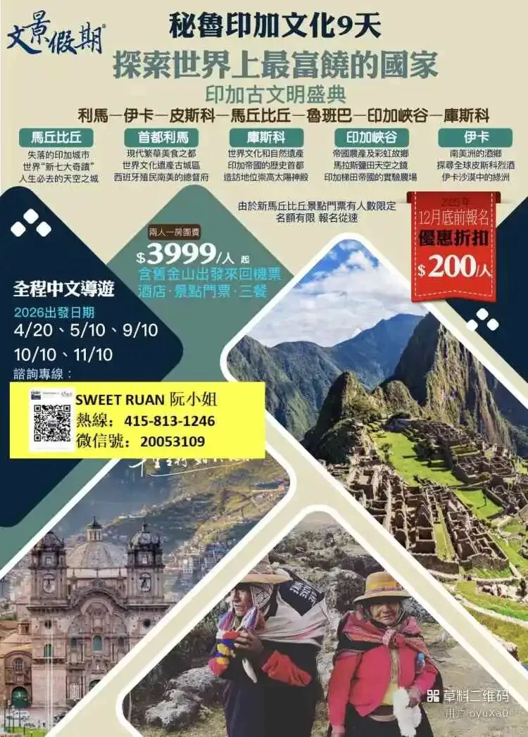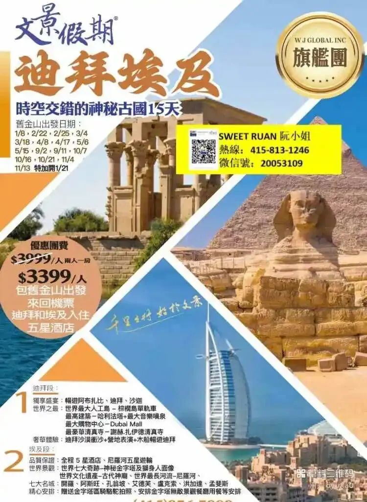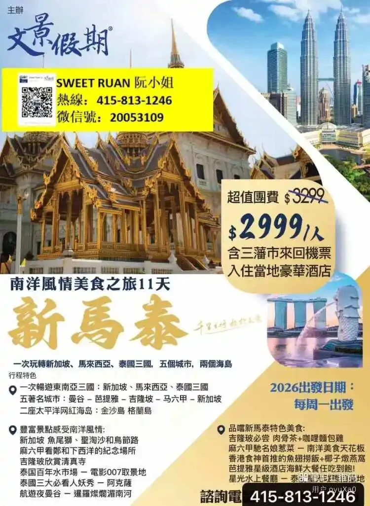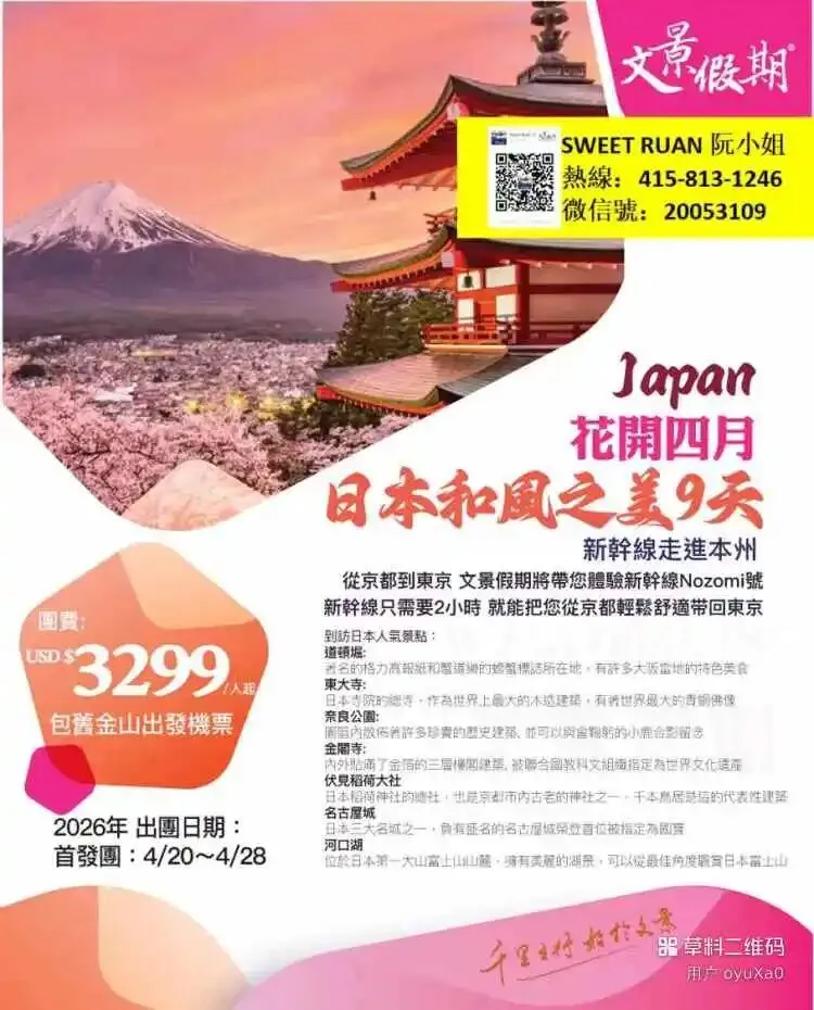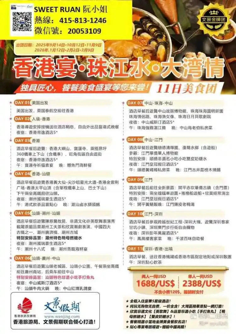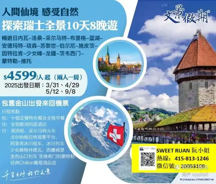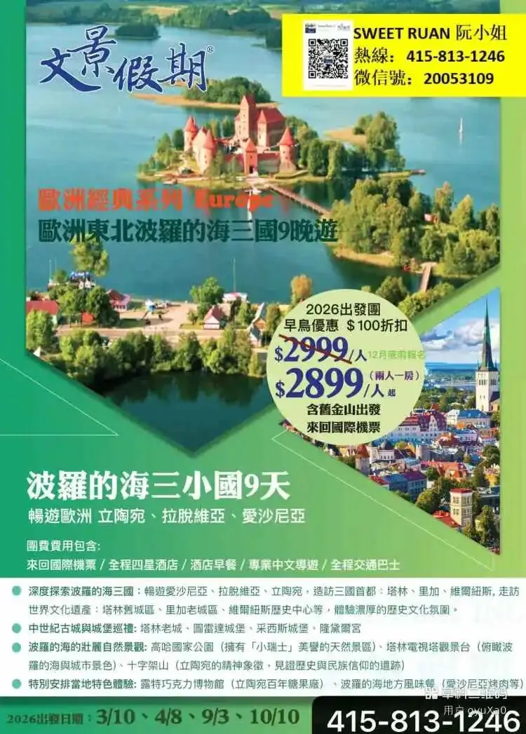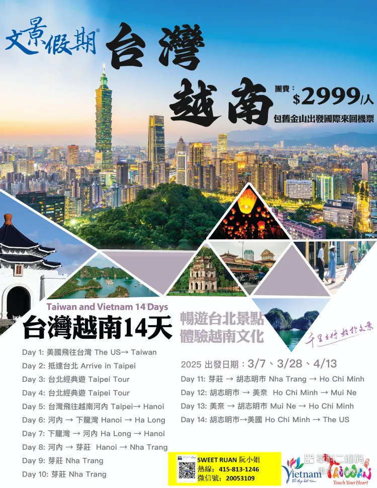 ![]() | 歡迎來諮詢詳細信息。 如果有需要“請聯繫” 文景假期旅遊顧問 Sweet Ruan 阮小姐 美國1-415-813-1246 請掃描左側獲取更多 微信號:20053109 |