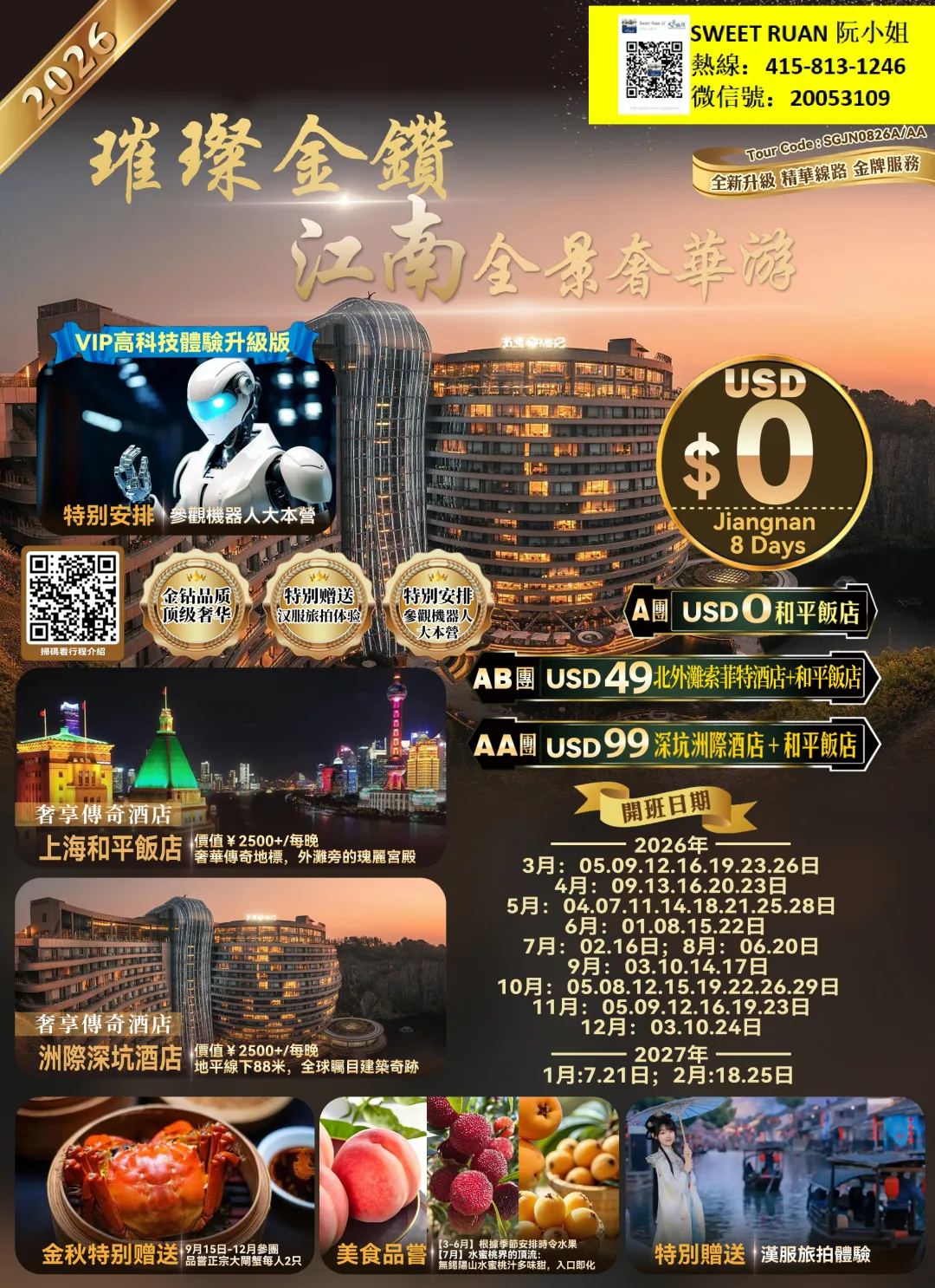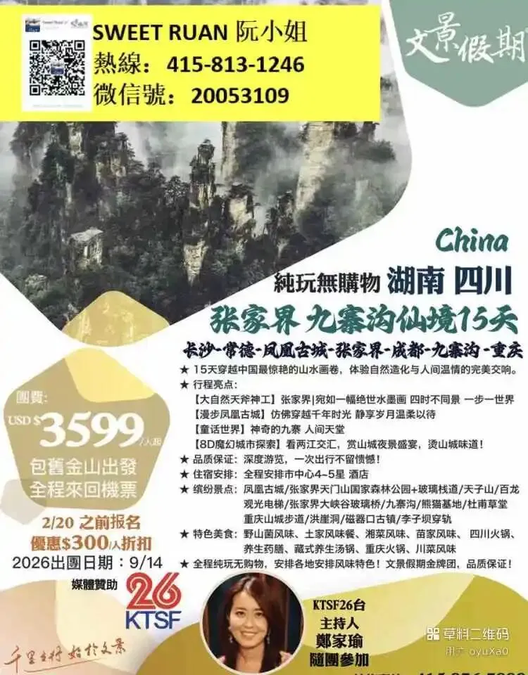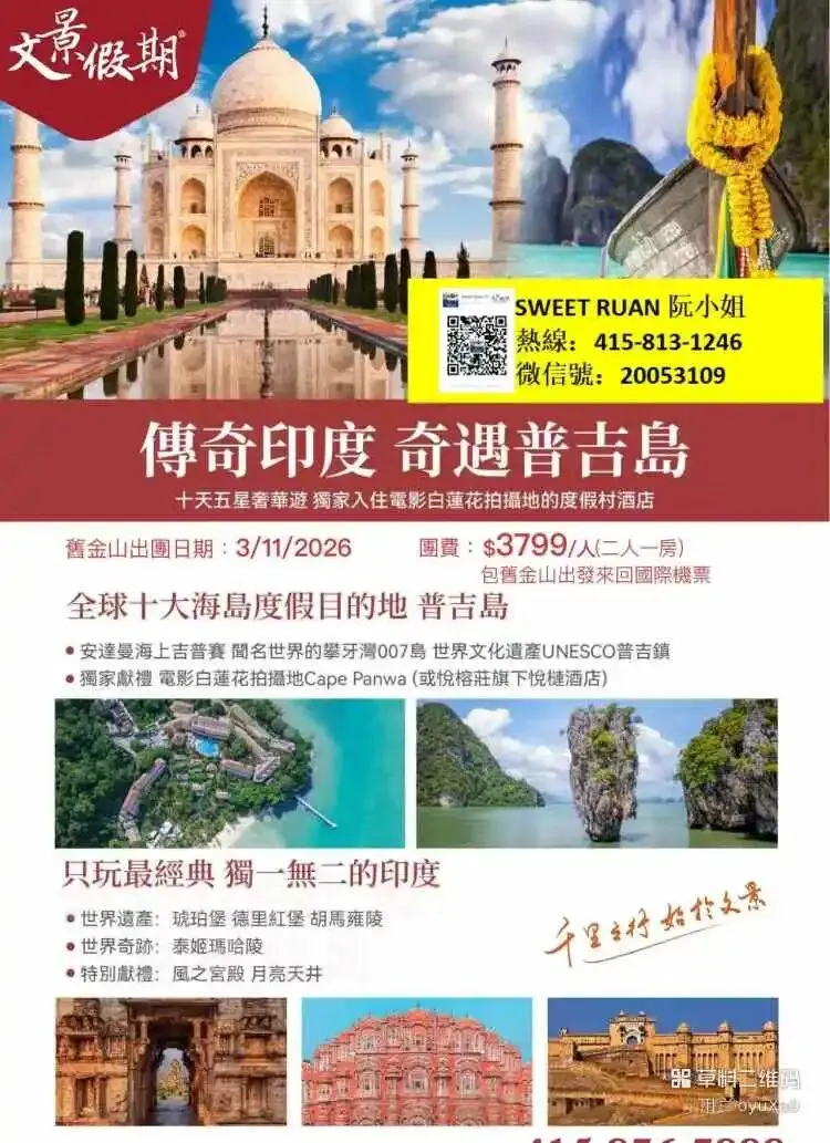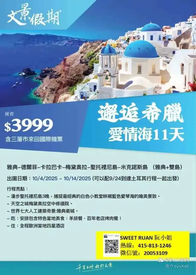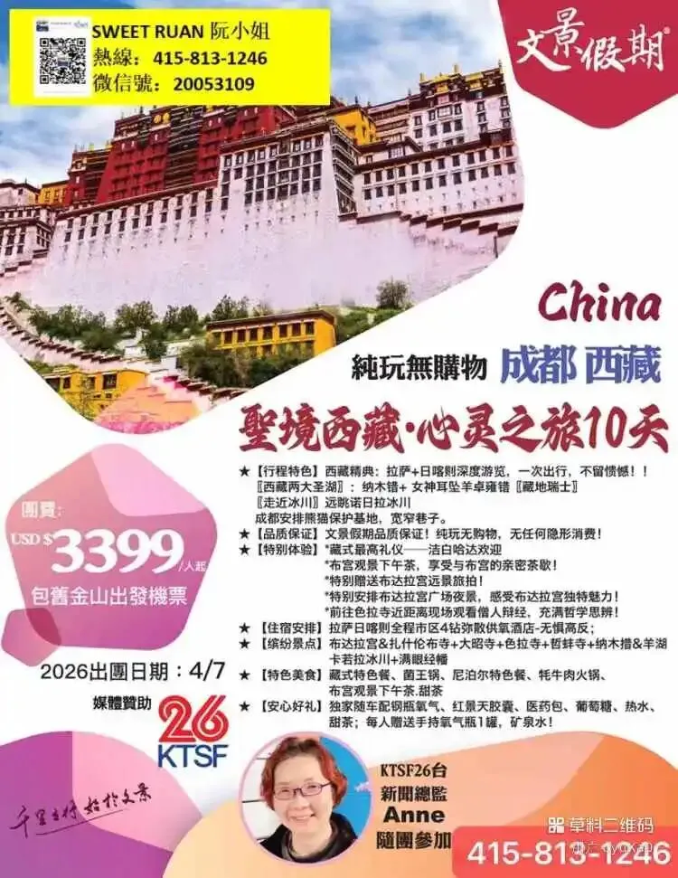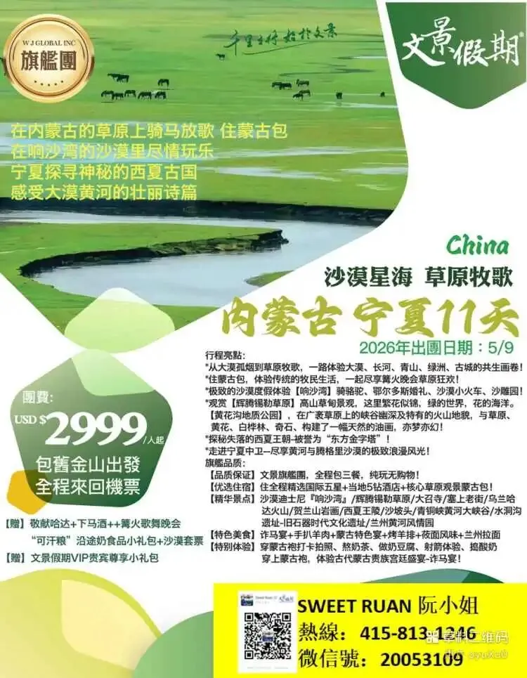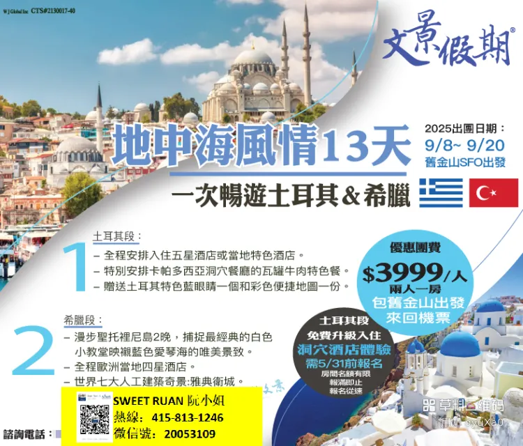 ![]() | 歡迎來諮詢詳細信息。 如果有需要“請聯繫” 文景假期旅遊顧問 Sweet Ruan 阮小姐 美國1-415-813-1246 請掃描左側獲取更多 微信號:20053109 |