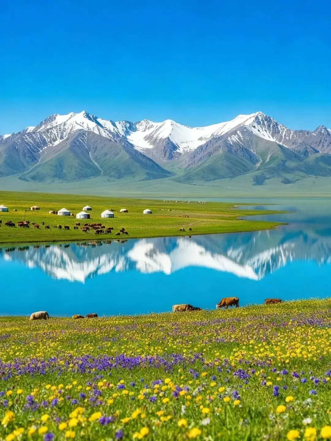 湖水蓝得像被洗了无数遍的宝石,四周雪山环抱,野花在湖边开成一片。环湖公路上开车,左边是湖,右边是草原,风里都是青草香。坐在湖边发呆,看天鹅游过,会觉得时间都慢成了诗。