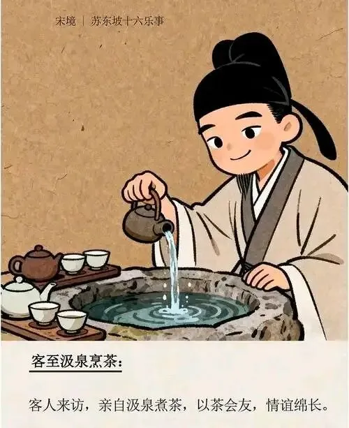 此为苏东坡谪居生活中的清雅之乐。表面是寻常待客:客人来访,亲自汲取山泉、烹煮香茗。其乐有三:一乐在人情暖,逆境中友至如春;二乐在山水趣,汲活水、品真味,与自然共生息;三乐在平常心,将困顿日子过成诗意修行。此即东坡本色——于最简朴处,活出最高级的丰盈与温度。