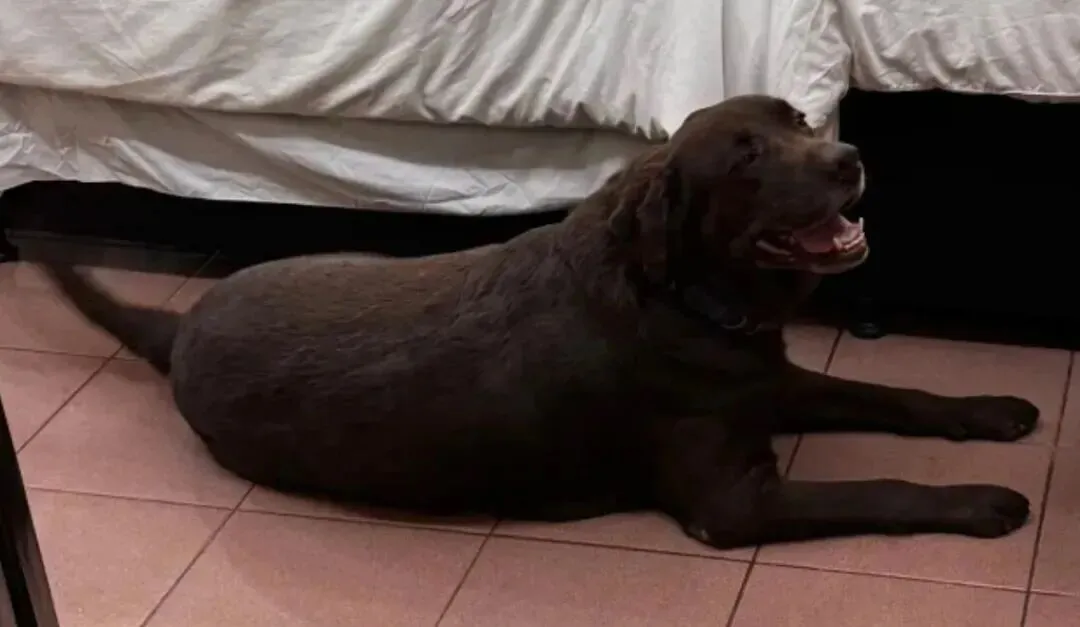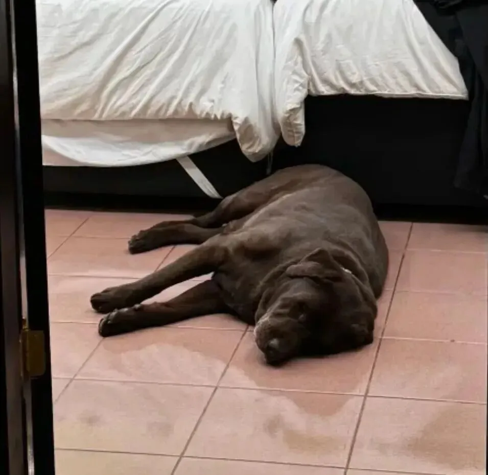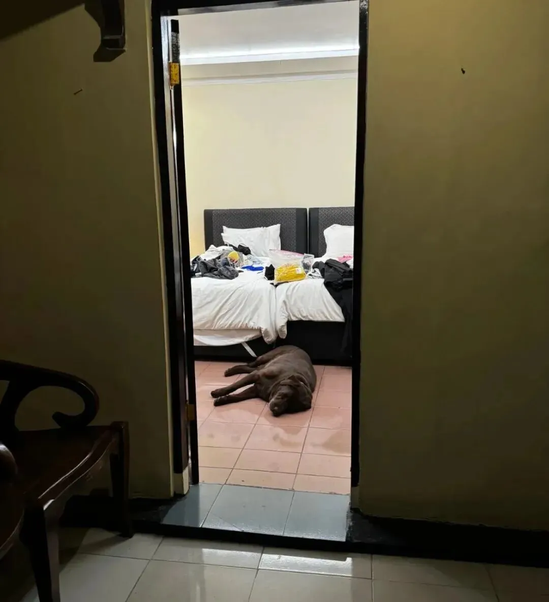两个女生想把它请出去 , 但你知道拉布拉多那体格 , 死沉死沉的 , 根本推不动 , 后来这大哥直接往地上一趴 , 打算睡了 , 合着把人家酒店房间当自己家了是吧~