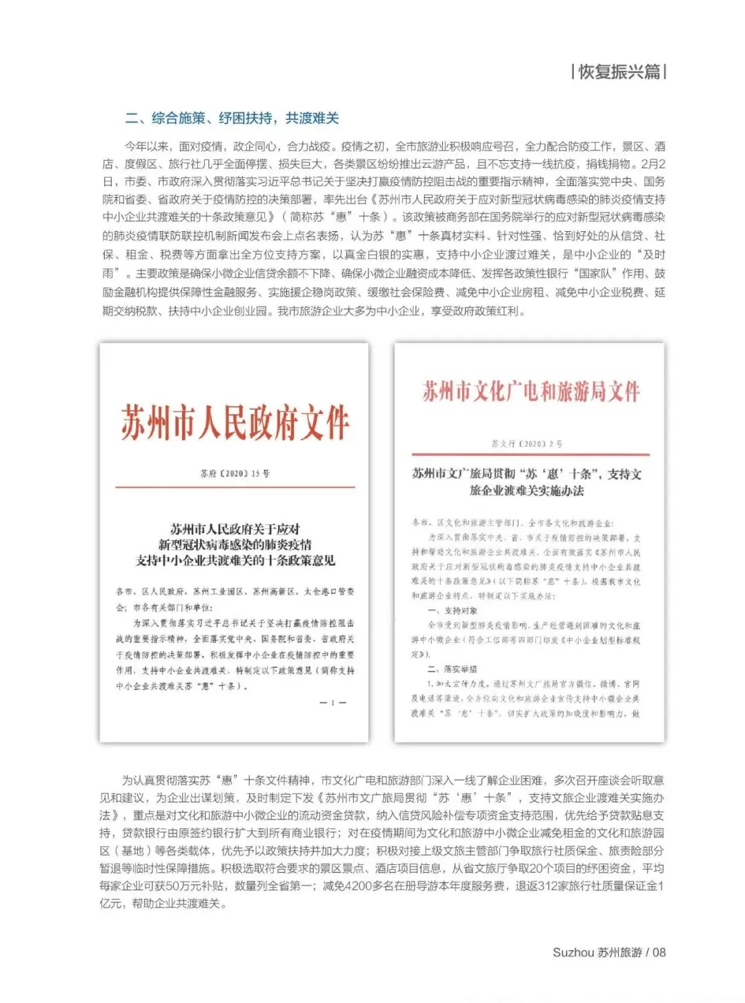纾困层面,率先推出苏 “惠” 十条,文旅部门配套实施办法,为中小文旅企业提供信贷贴息、租金减免,暂退旅行社质保金 1 亿元、减免导游服务费,争取省级纾困资金数量全省第一;