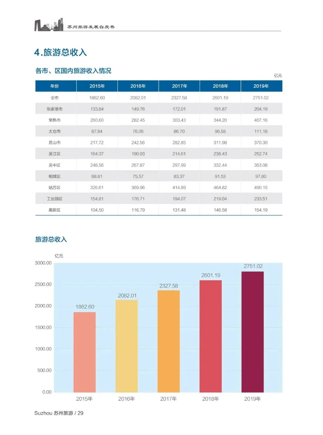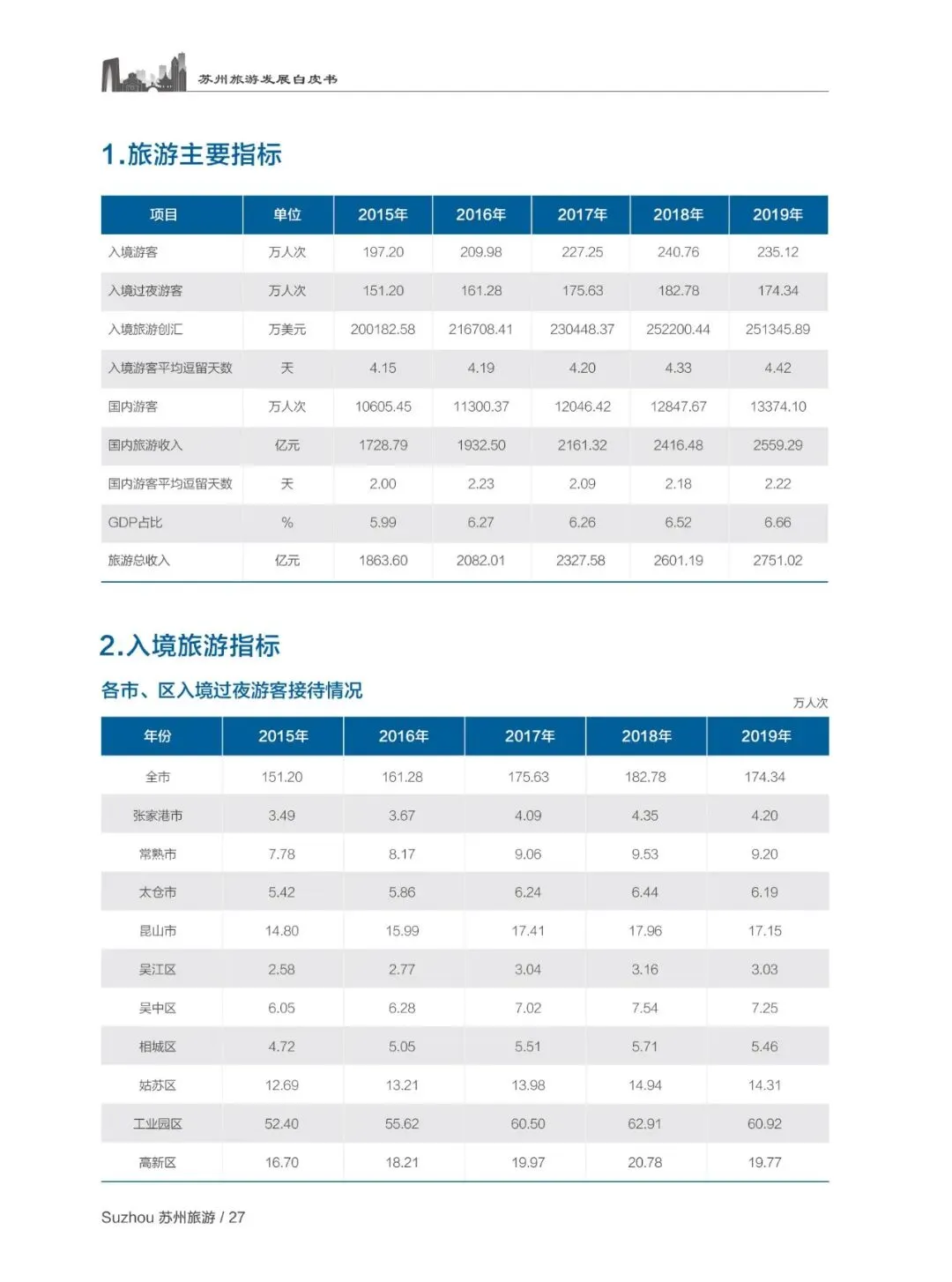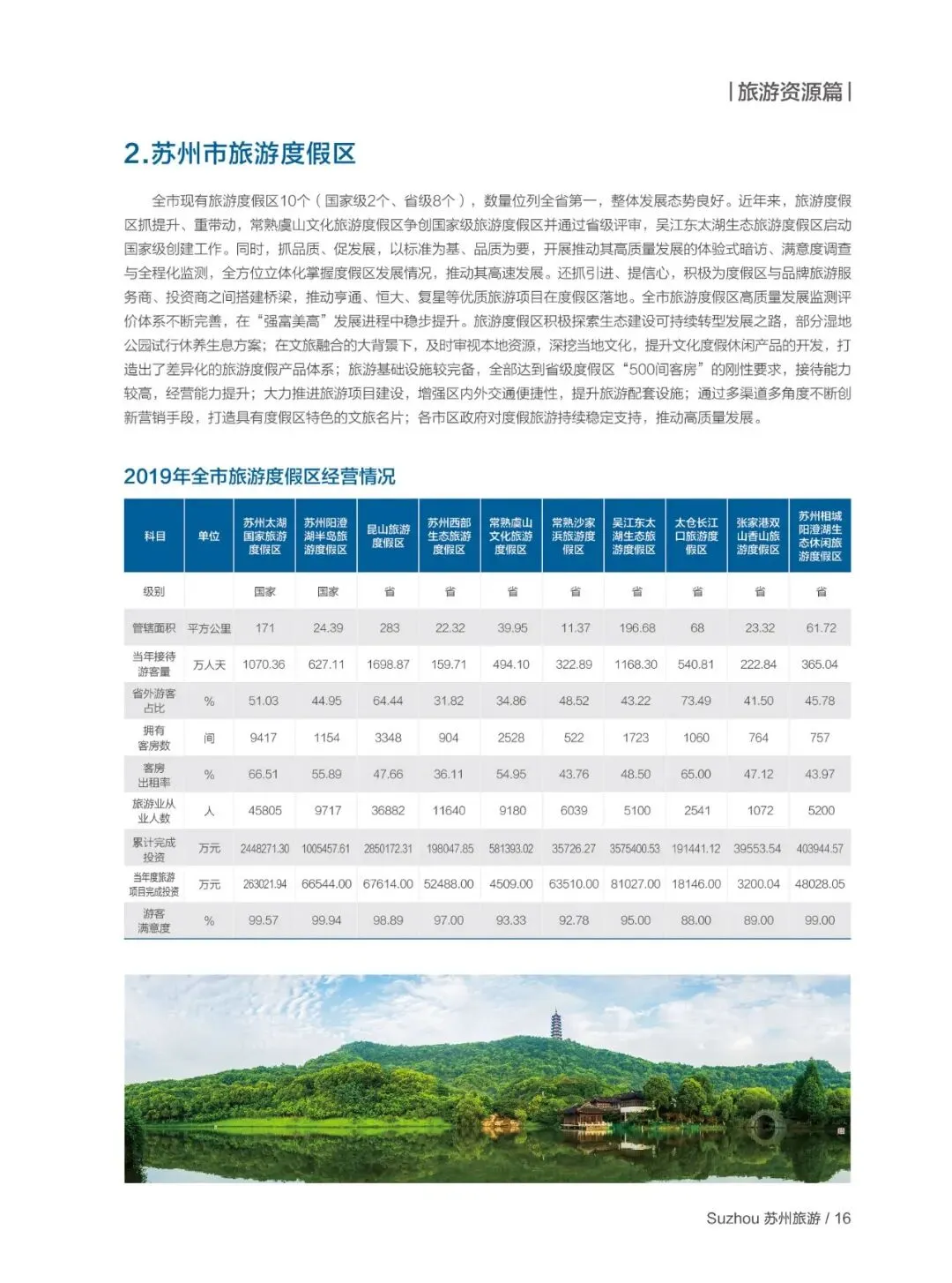 “十三五” 期间苏州旅游业践行新发展理念,战略性支柱产业地位持续巩固,2019 年接待国内游客 13374.1 万人次、入境过夜游客 174.3 万人次,旅游总收入 2751 亿元,三大指标均居全省第一,旅游业增加值占 GDP 比重达 6.7%,累计旅游项目投资超千亿元,全域旅游建设全面推进。