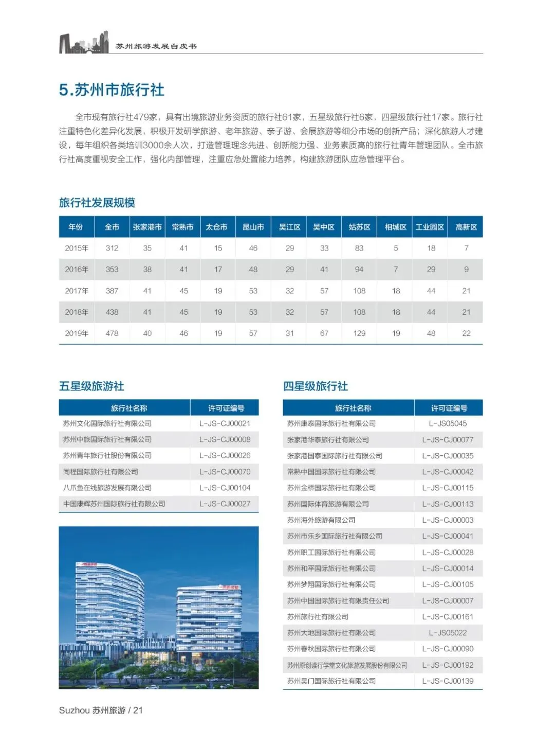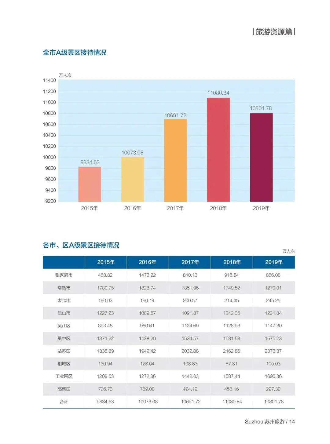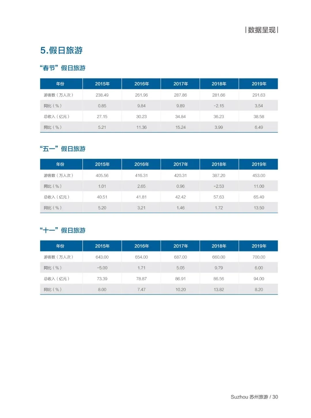 “十三五” 期间苏州旅游业践行新发展理念,战略性支柱产业地位持续巩固,2019 年接待国内游客 13374.1 万人次、入境过夜游客 174.3 万人次,旅游总收入 2751 亿元,三大指标均居全省第一,旅游业增加值占 GDP 比重达 6.7%,累计旅游项目投资超千亿元,全域旅游建设全面推进。