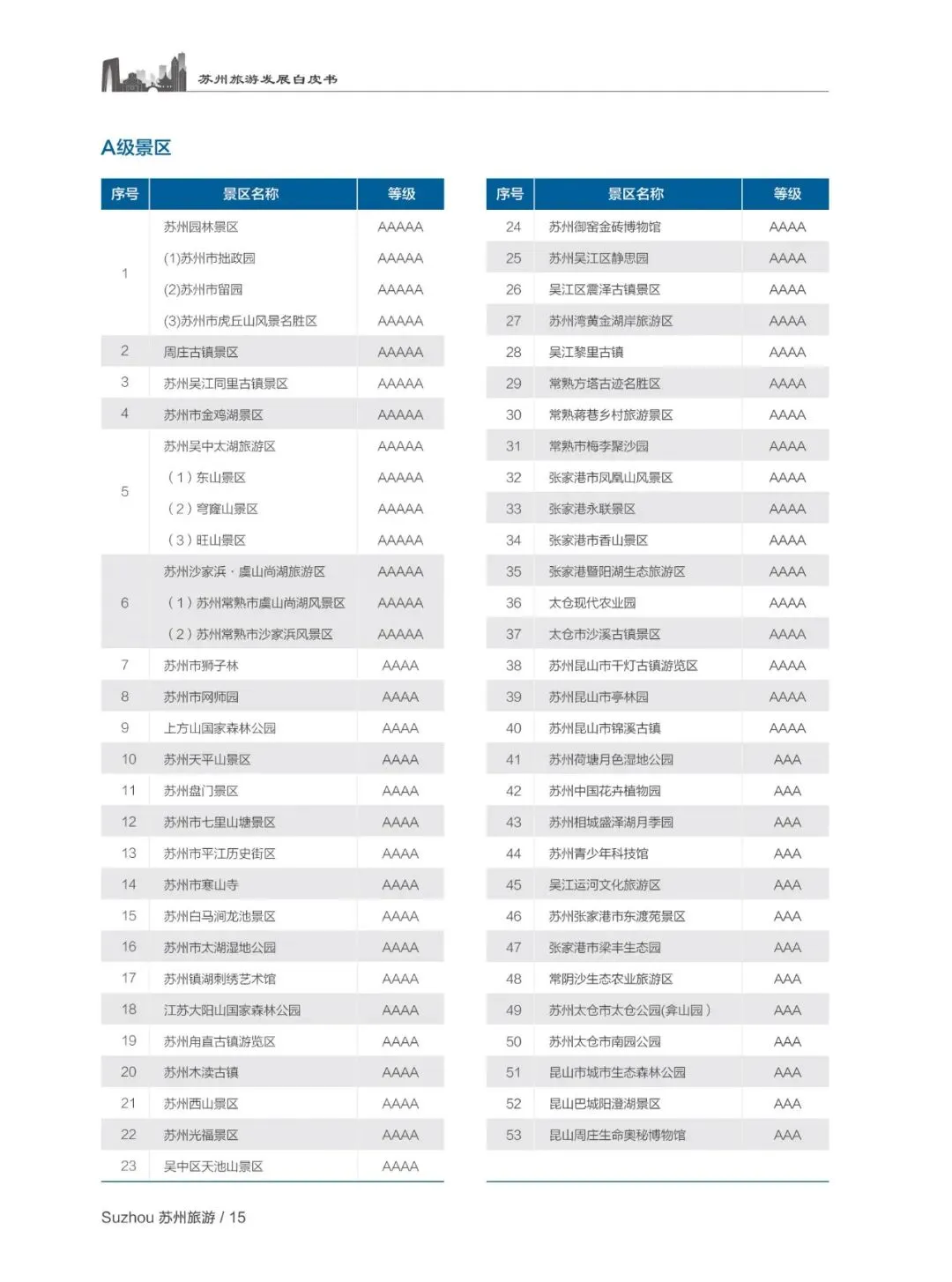 核心景区:53 家 A 级景区(58 个点),5A 数量列全国旅游城市第三,园林古迹、古镇古街为核心特色,景区积极推进智慧旅游、夜间演艺、文创开发,实现遗产保护与旅游发展双赢;