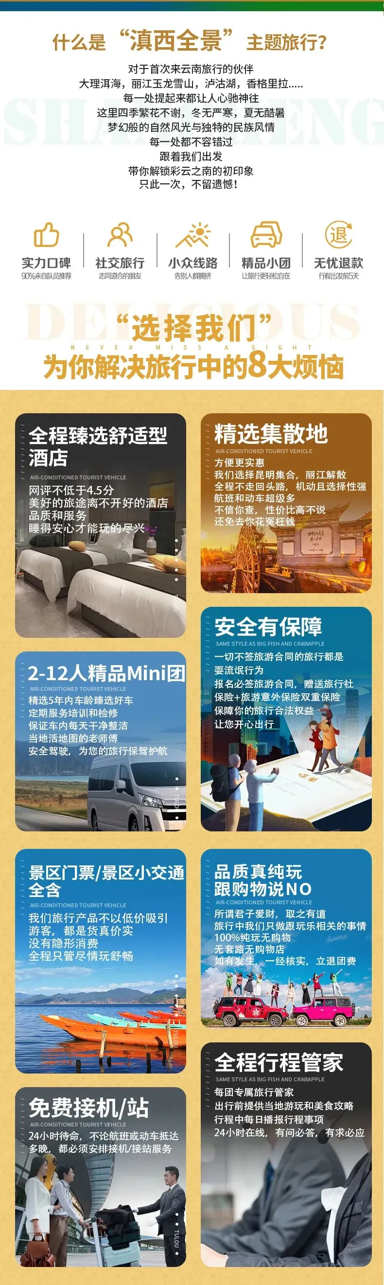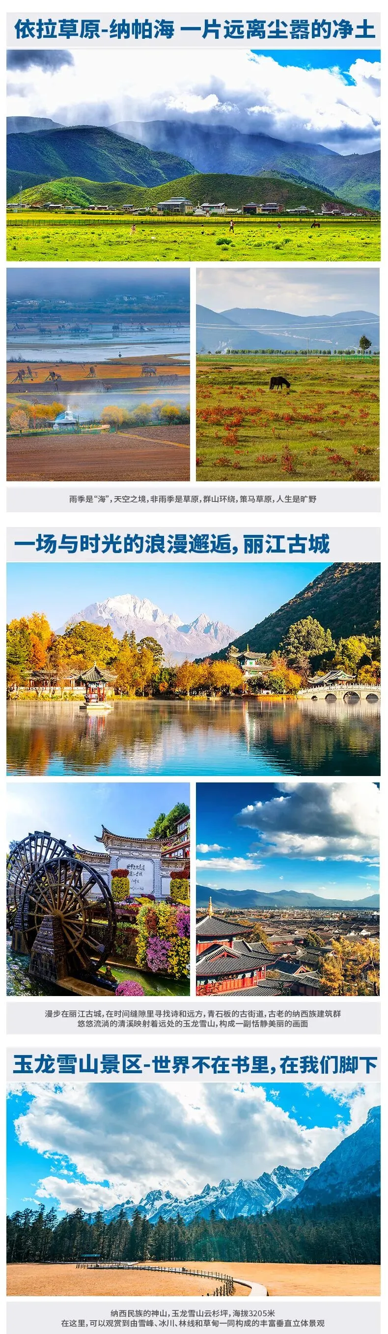 ▷交通:不包含各地到达昆明集合、丽江散团的往返大交通费用(如:机票和高铁火车票等,提前预定通常折扣都会很低);