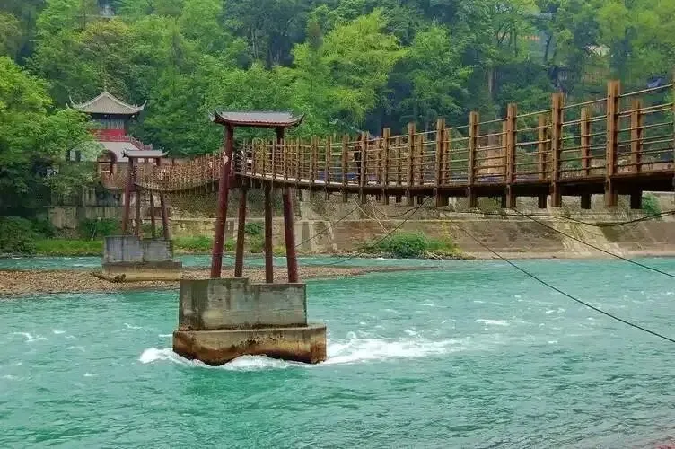 飞架岷江,横跨都江堰。安澜索桥是战国末期李冰建都江堰时始建。安澜索桥是我国著名的五大古桥之一,又名安澜桥、夫妻桥,全长240多公尺,飞架岷江南北,横跨都江堰水利工程,是古代四川西部与阿坝之间的商业要道。