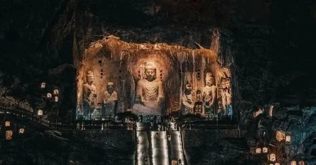 整座城都被牡丹包围了 , 倾城绝色不是形容词 , 是真实画面。 龙门石窟在牡丹文化节期间开放夜游 , 西山石窟被灯光点亮的那一刻 , 震撼 , 真的会愣住。