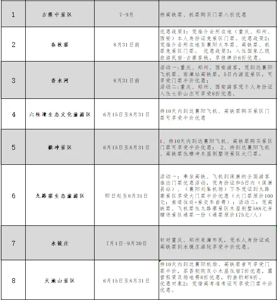 7. 武陵峡口生态旅游区、峡州清江天龙湾旅游度假区、长阳清江方山景区:凭抵达宜昌市高铁站的高铁票,享受成人票门票5折优惠。