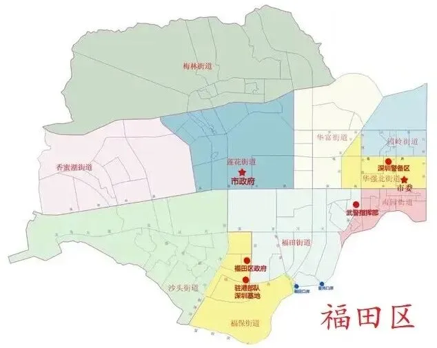 福田区辖10个街道:园岭街道、南园街道、福田街道、沙头街道、梅林街道、华富街道、香蜜湖街道、莲花街道、华强北街道、福保街道。区政府驻福民路。