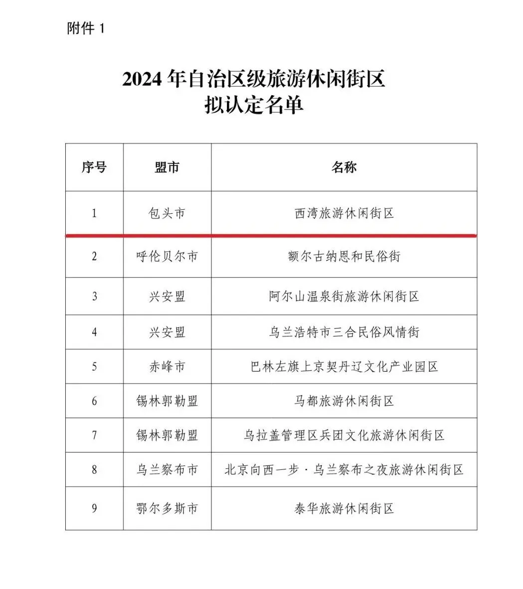 自治区文化和旅游厅公示了《关于2024年自治区级旅游休闲街区、康养旅游示范基地和滑雪旅游度假地拟认定名单》,土右旗的西湾旅游休闲街区入选!