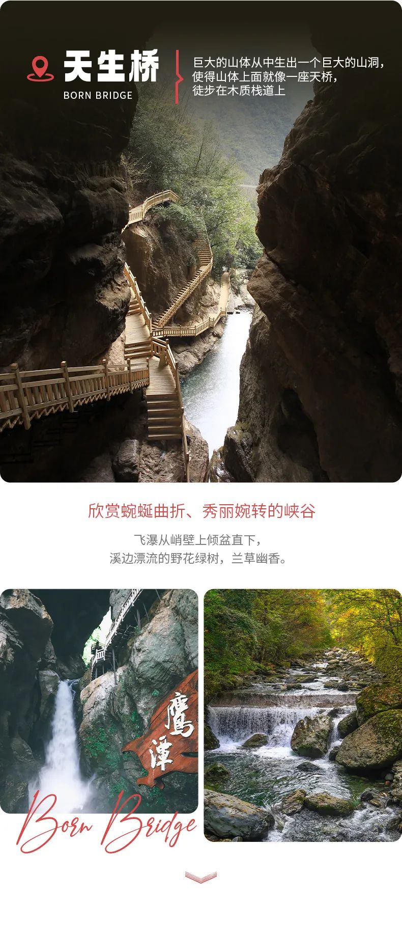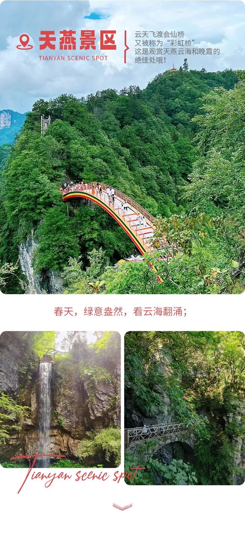 天燕景区主要得名于燕子垭山口。从燕径与云栈有一个连接点是称为云天飞渡的会仙桥,又被称为“彩虹桥”,这是观赏天燕云海和晚霞的绝佳处哦!