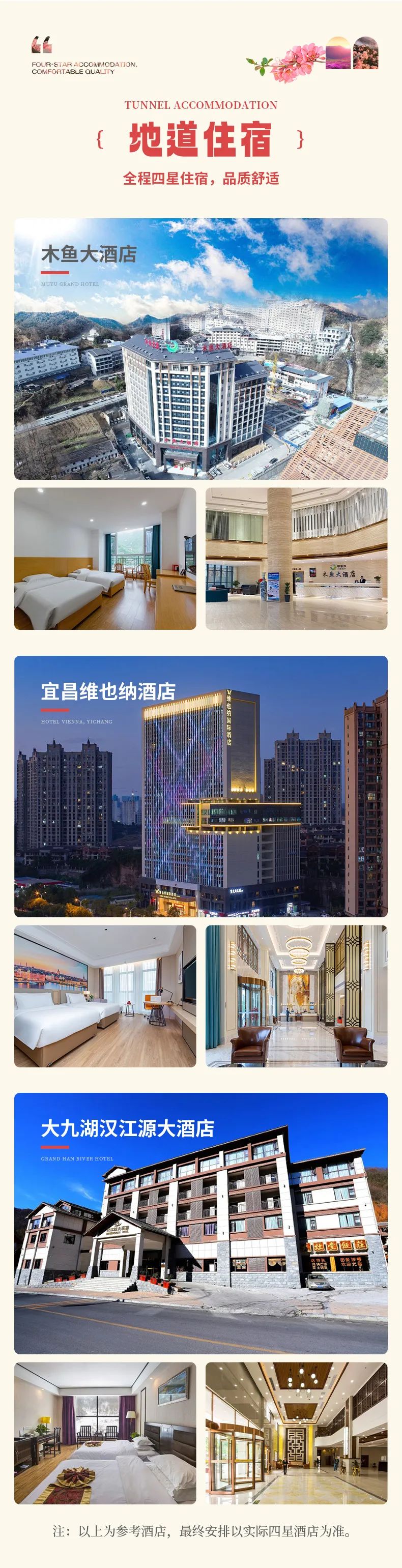 2.住 宿:宜昌准四星酒店1晚(参考维也纳酒店)、坪阡古镇准四星酒店1晚(参考汉江源酒店)、木鱼镇准四酒店2晚(参考木鱼大酒店)