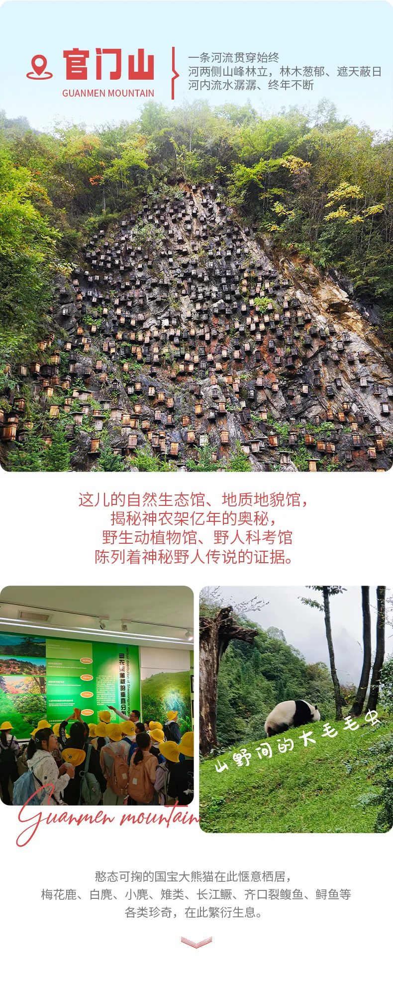 然后我们再前往官门山——动植物基因库,官门山就像是一个博物馆,主要是人文景观,可以看熊猫,看各种博物馆,关于神农架的植物,动物,及神农架的形成历史,及野人的考察成果。这里更有国宝熊猫、娃娃鱼等可爱的珍惜动物,以及神农架特有的岩壁蜂巢;