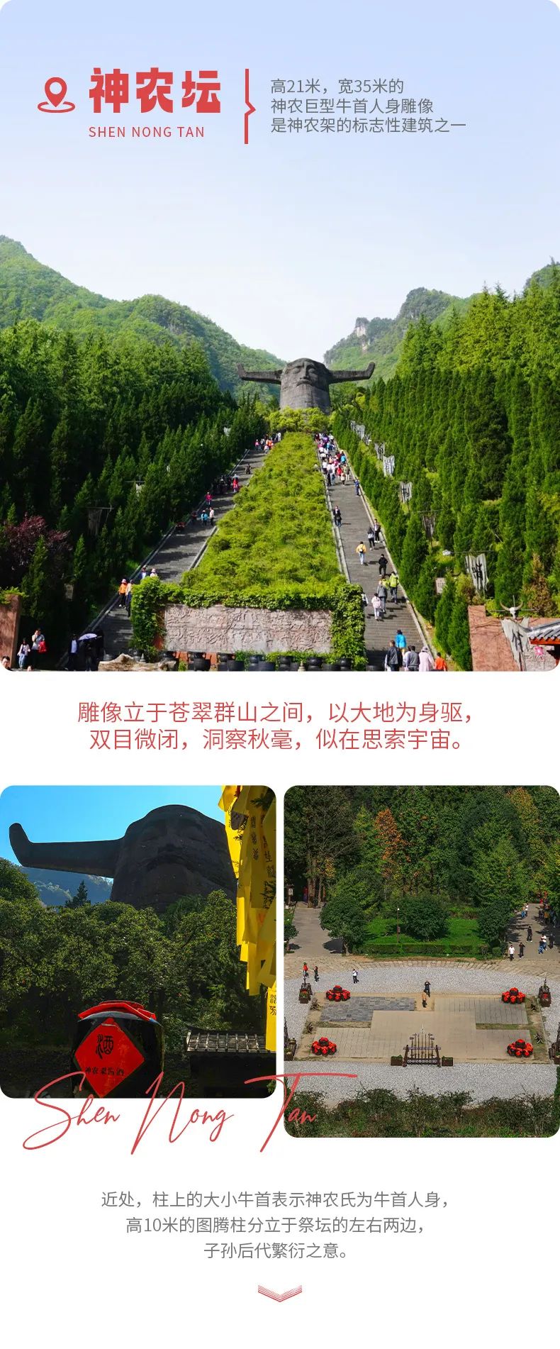 上午,我们将前往神农坛。神农架的得名,正式因华夏祖先之一的神农氏,在这里架木为梯尝百草,拯救黎民百姓而得名。在神农坛,有着神农氏的牛首人身雕像和千年杉王。