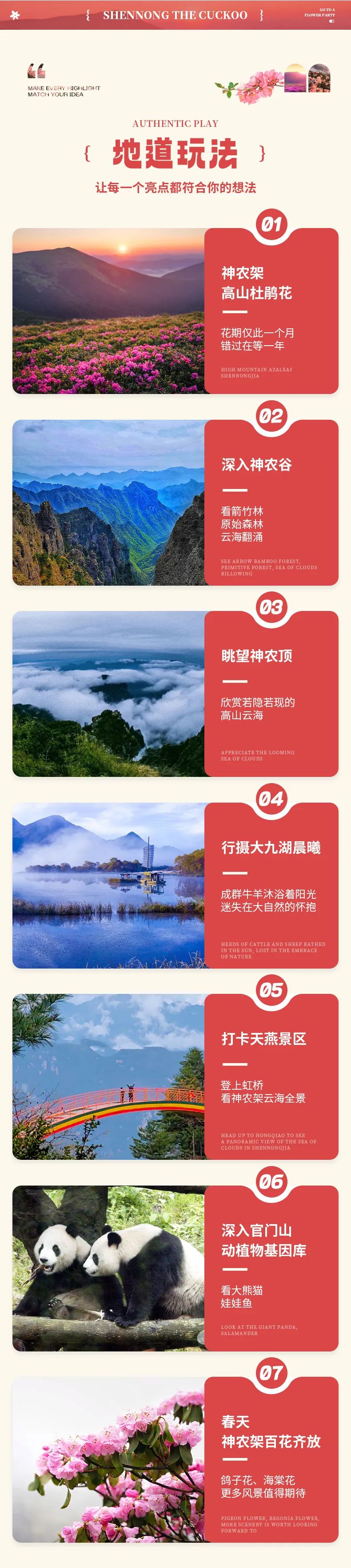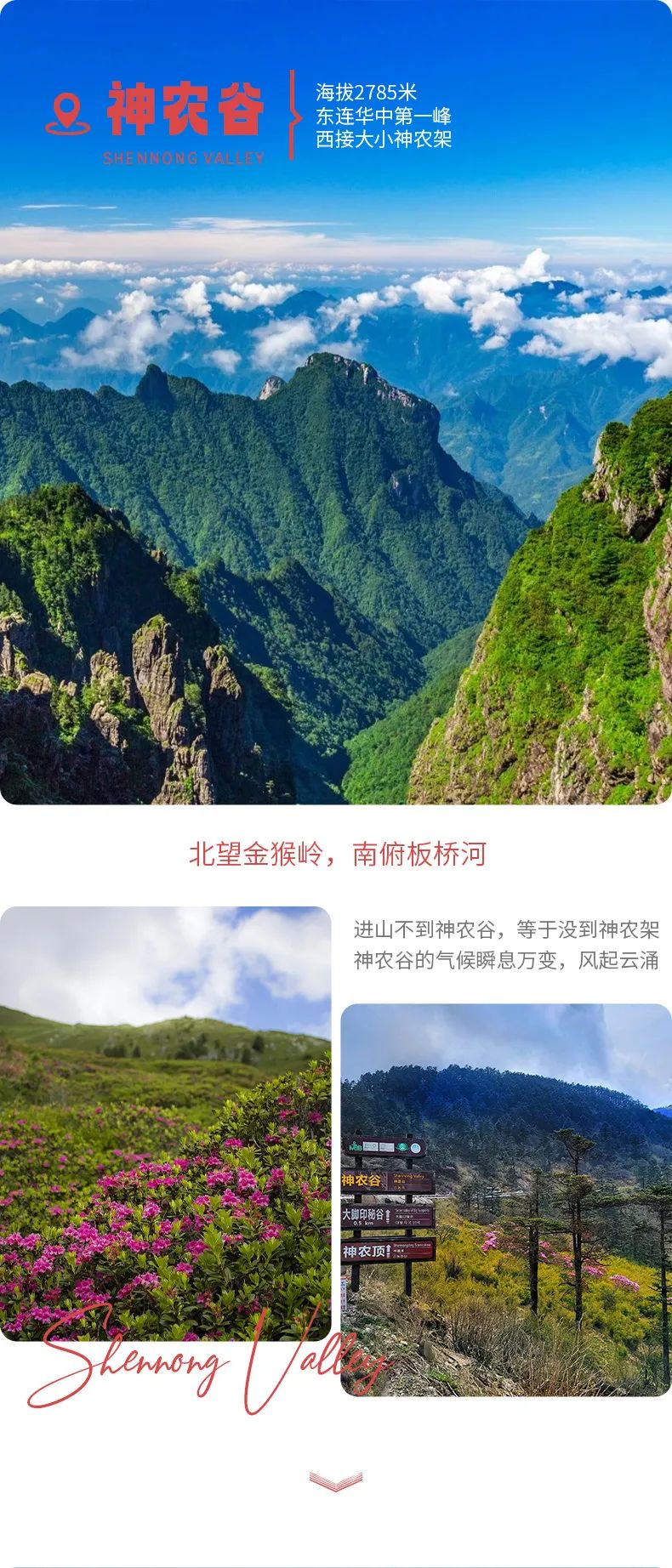 接下来,我们将前往神农谷,,我们一路前行,可以看到茫茫的高山草甸、云海、森林、石林、古树等自然景观。而5月份开始,成片的高山杜鹃花更是将开的如火如荼,给这片原始的森林点缀上了粉嫩的春意,这也是神农架最美的时刻。