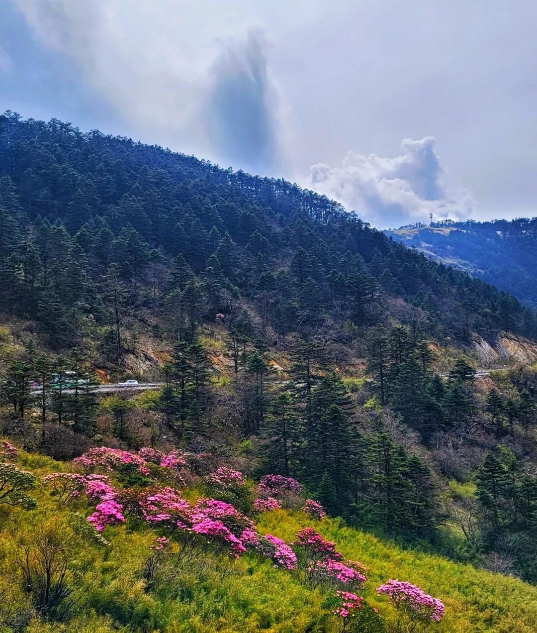今天,大家一早从宜昌乘车前往神农架,大概3个多小时到达木鱼镇,而后前往神农顶区域,一路从神农营至太子垭海拔2000米以上区域,漫山遍野的杜鹃花绵延十多公里。我们一路上都可以边乘车边欣赏高山杜鹃花的景观
