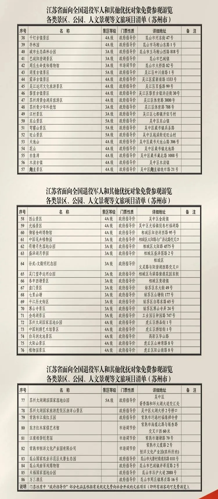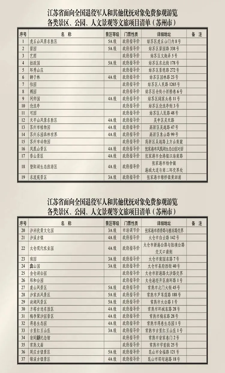 近日,江苏省文化和旅游厅整理发布退役军人免费游水韵江苏景区目录,全省近500个景区景点(4A级以上景点近200家)全部持证免门票!,苏州共有86个景区景点入选,数量位居全省第一!