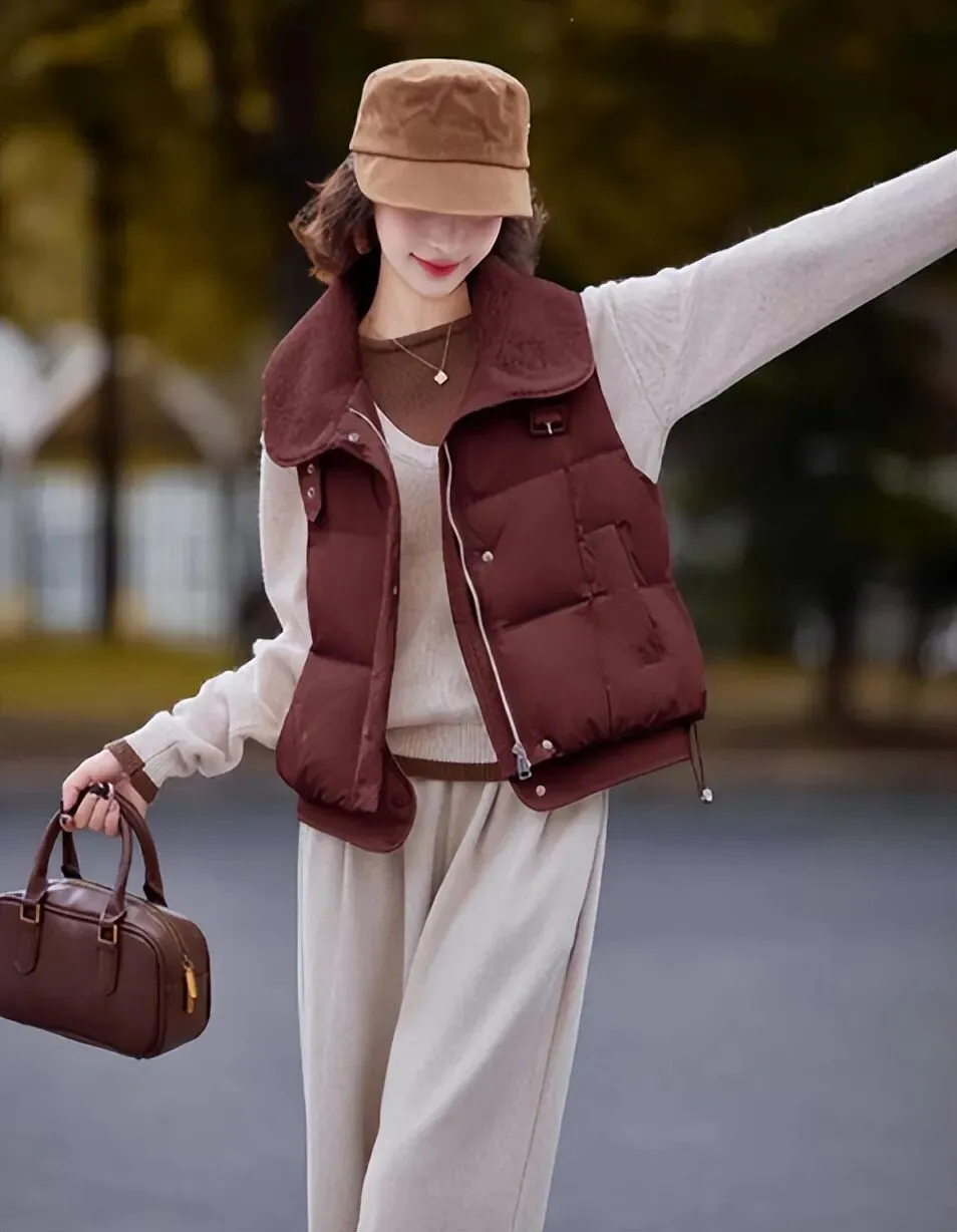 秋天温度还没彻底掉下去时,短款羽绒马甲很好用,轻,利索,走路抬手都不费劲,视觉上也更显高。