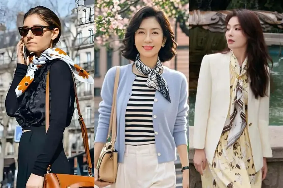丝巾更适合没那么冷的天,系上去人立刻显得有精神,和风衣,针织开衫,西装外套放在一起画面很顺。