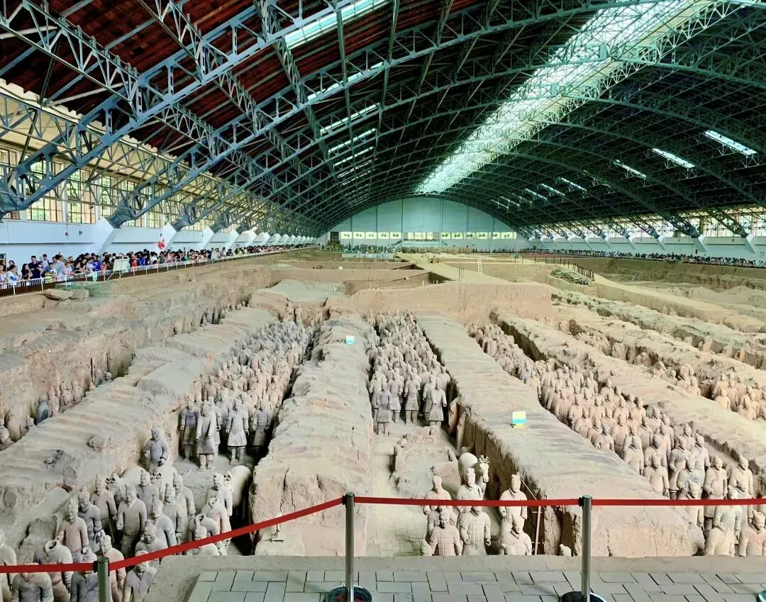 三大俑坑总面积超过50个足球场,出土陶俑超8000件,是全球唯一按实战军阵排列的地下军队。其宏大的布局,如一号坑1400多件陶俑列成38路纵队,能让人瞬间感受到“千军万马”的压迫感与秦帝国的军事实力,是中华文明的象征与“世界第八大奇迹”。