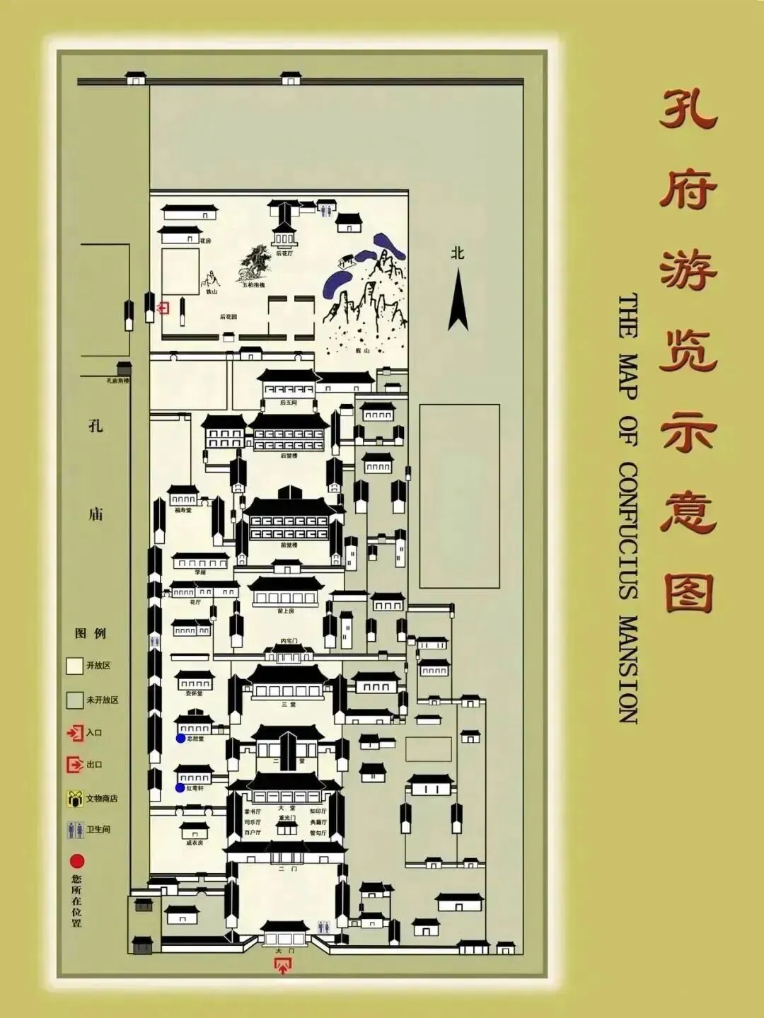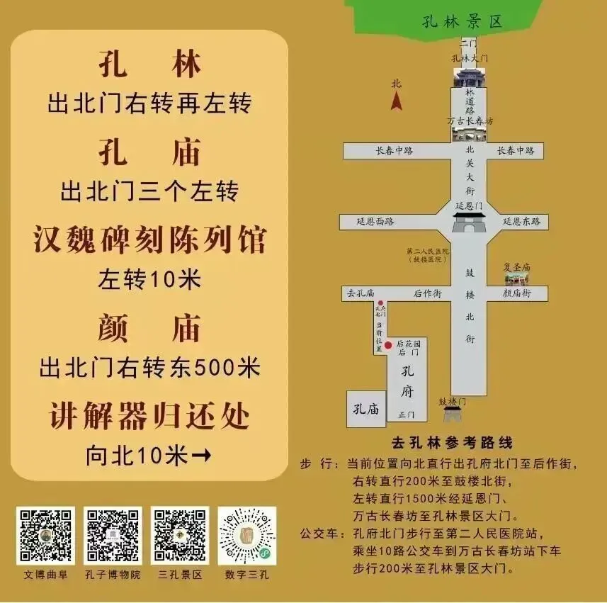 孔庙快睹门出口-孔府钟楼检票口或鼓楼门检票口-孔府后花园出口(推荐出口)或鼓楼门出口-孔林正门(出、入口)