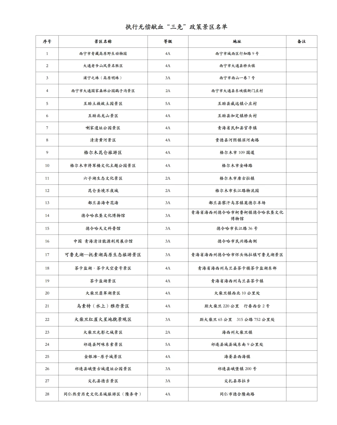 当热血为生命续航,我们将用温情回应每份善意!为贯彻落实关于印发《青海省无偿献血“三免”政策实施细则》的通知(青卫健〔2024〕141号)要求,做好“三免”政策推进实施工作,即在符合文件实施范围的无偿献血者,凭(已实名认证的)无偿献血电子献血证即可享受无偿献血“三免”政策景区名单内首道门票免费。现将落实上述政策的旅游景区名单公示如下: