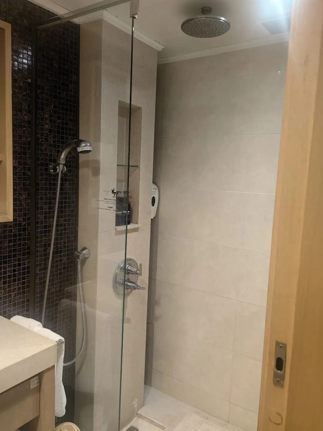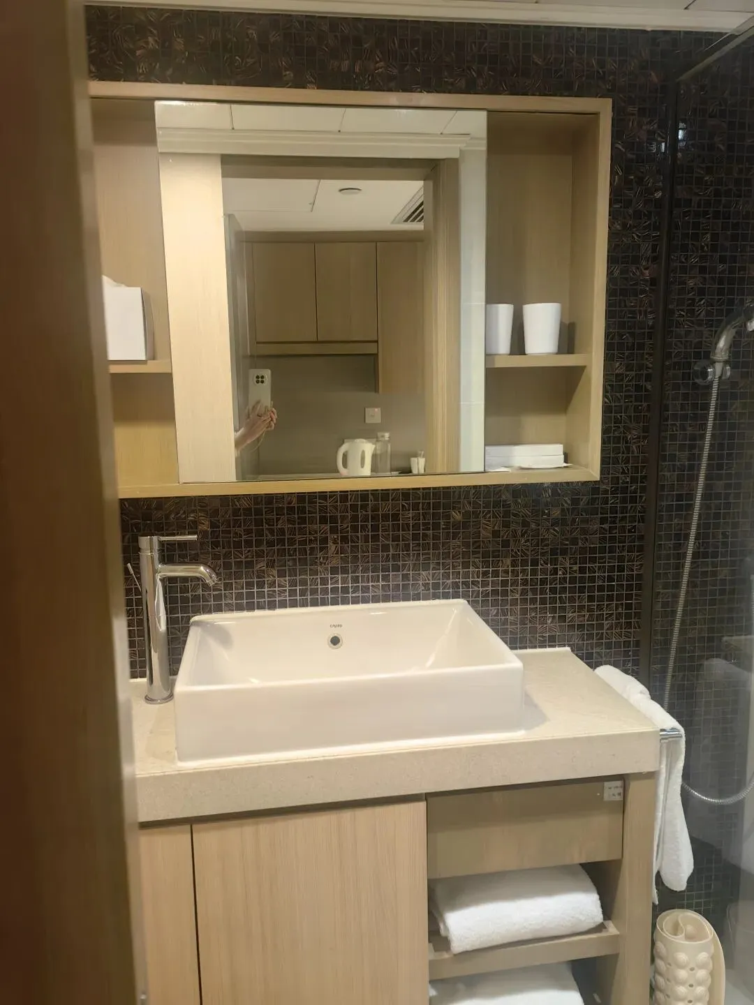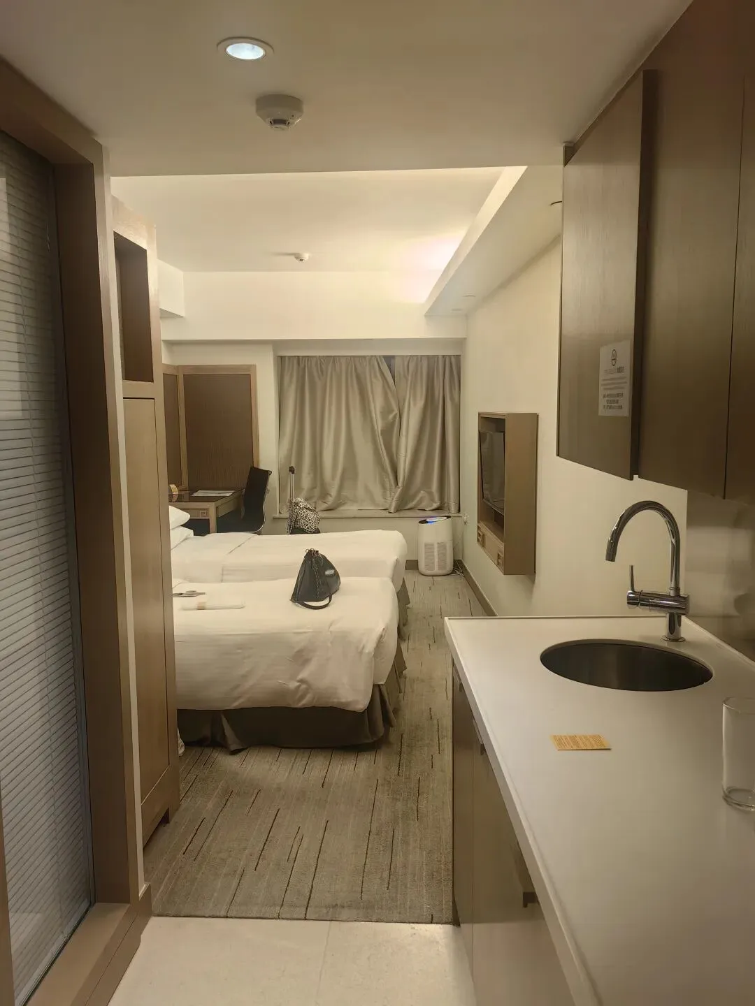 导游接机,机场出口乘巴士送至荃灣帝景酒店 (有一次性洗漱用品+拖鞋+吹风机+空气净化器,总体空间较小,床0.9*1.8,翻身有掉落风险)