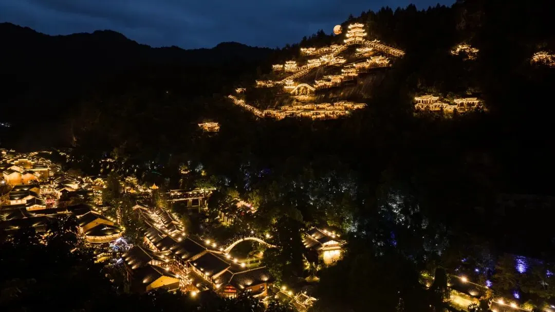 “悬崖仙侠世界”望仙谷悬崖民宿与山谷光影营造出梦幻氛围。