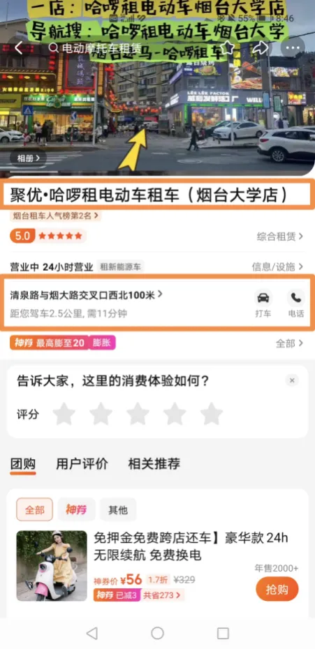● 在烟台可以租个电车骑车游玩,价钱45 元-69 元不等,差不多都可以骑一天了,那上面还能免费换电和还车,便宜的租车行名是聚优•哈啰租电动车电车(美团券后46 元)在烟大小吃街附近,开关锁是遥控的,如下图: