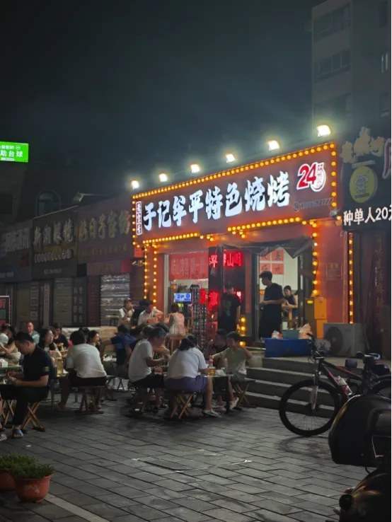 ● 逛完晚上可以吃“于记牟平特色烧烤”(烟大小吃街路边),我们吃的是左边门店较大的一家,他家份量大,味道还不错,就是去的时候吃饭的人不少,如图: