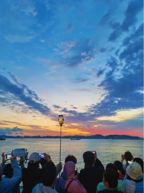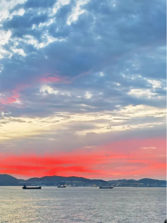 ● 风景及日出:晚上甲板上在未开船之前开始看一看拍拍照,开船后没啥看的,看日出的需要早起,人多还得排队,我们这个轮船是在凌晨4 点55日出,如图: