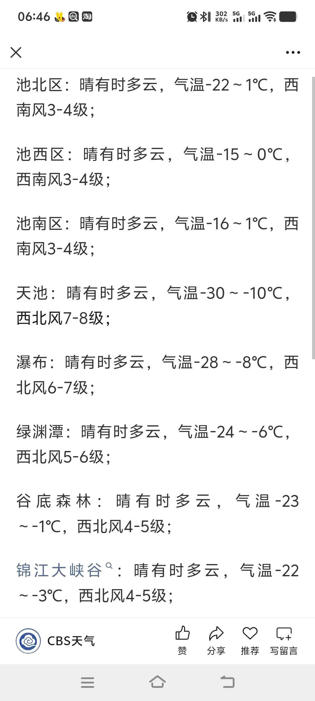 ➡️北景区天池主峰,风力较大,公路、栈道积雪,不具备安全运营条件,天池景点全天关闭。其他景点正常开放,视天气情况随时关闭。 ➡️西景区主峰,风力较大,公路积雪结冰,不具备安全运营条件,天池景点全天关闭。粉雪谷、锦江大峡谷景点,正常开放,视天气情况随时关闭。 ➡️南景区关闭。