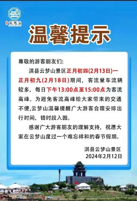 农历正月初四(2月13日)——正月初九(2月18日),景区将严格按照“限量、错峰”的要求做好流量管理,强化安全防范措施,切实落实各项保障工作,喜迎八方来客。