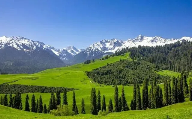 雪山、草原、云杉、野花 , 你对伊犁所有的幻想 , 这里全有。 它是国内面积最大的云岭云杉生长地 , 满眼都是绿 , 那种扑面而来的自然气息 , 太纯粹了。