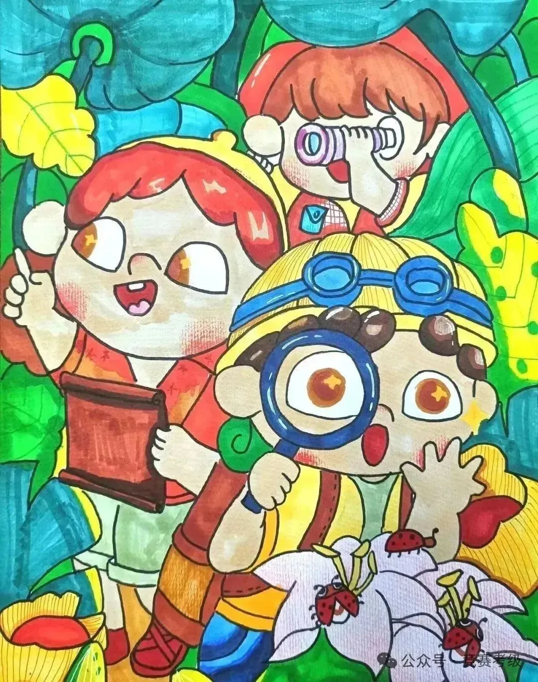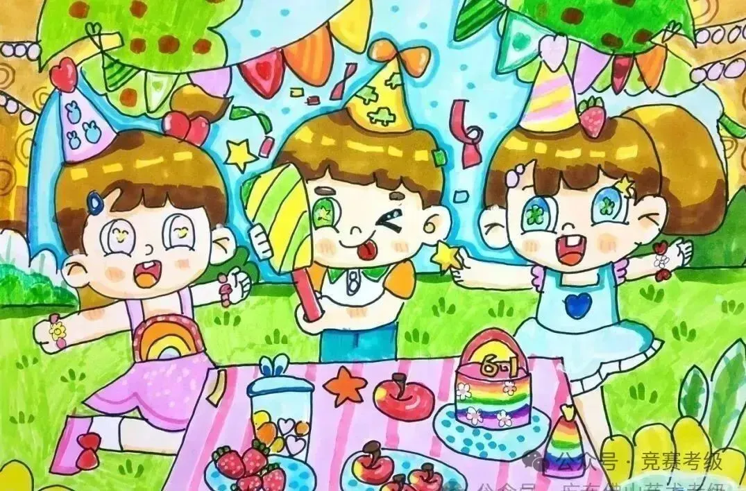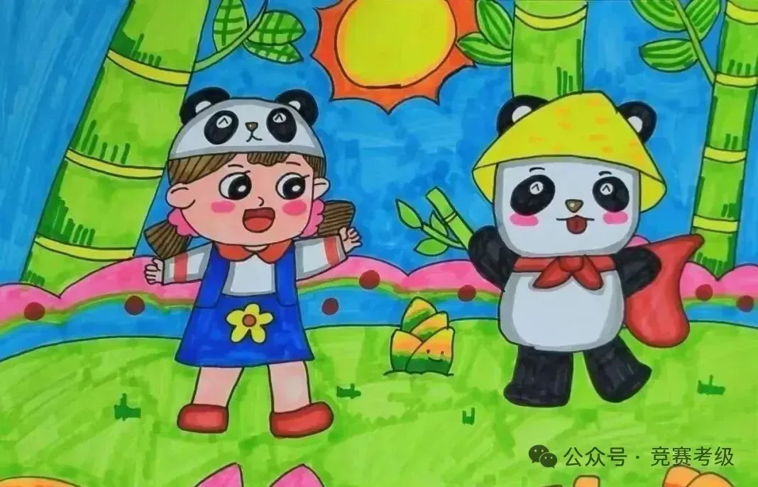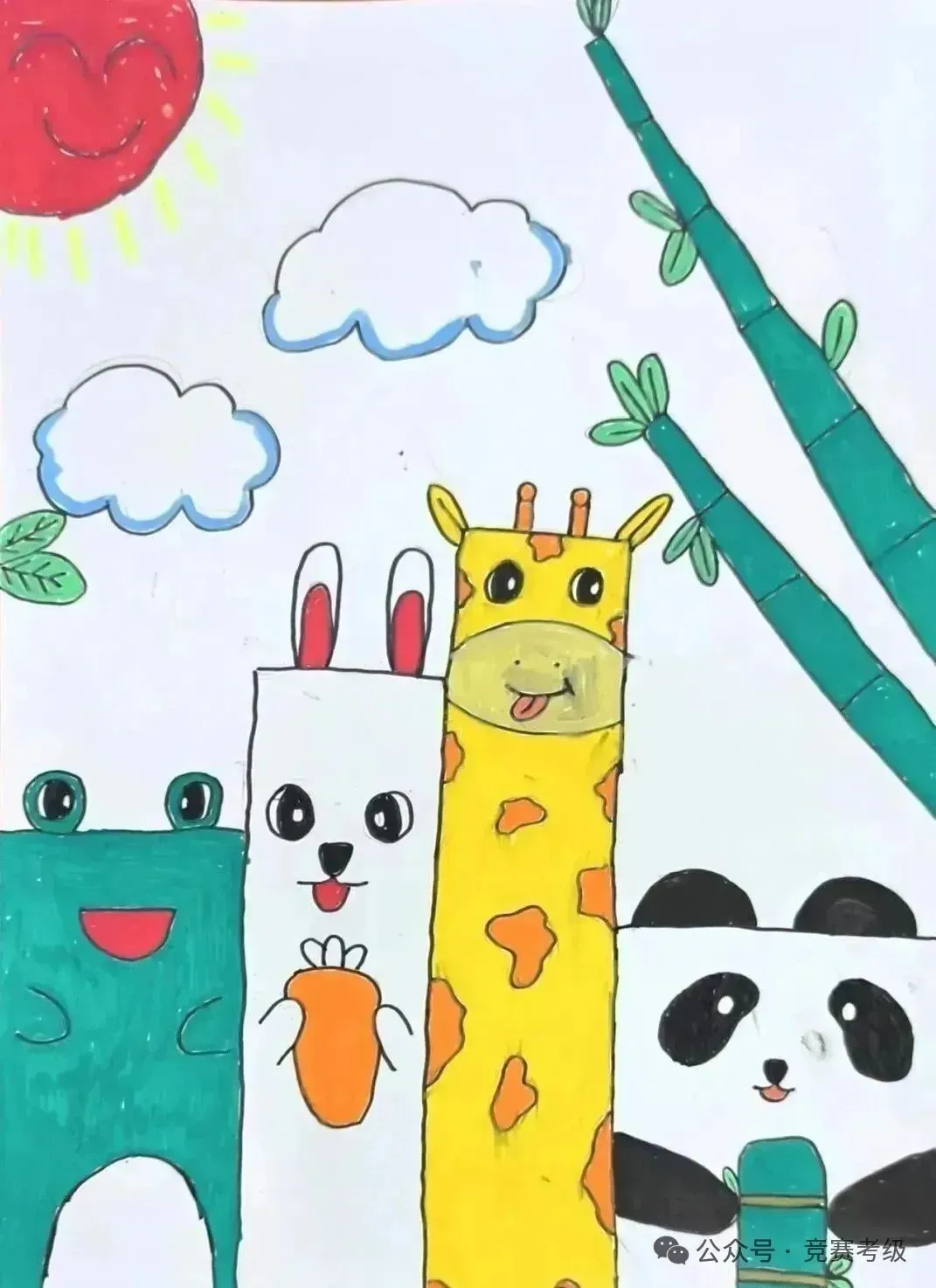 3 级:能运用线条、色彩等元素描绘出多个具体的形象,画面构成基本合理,具有一定的想象力。
