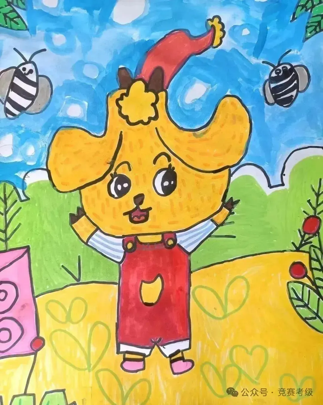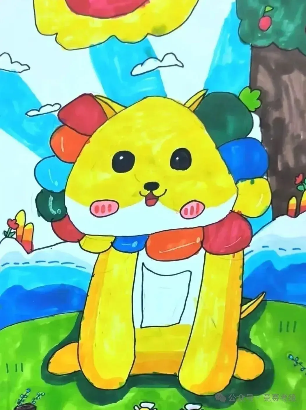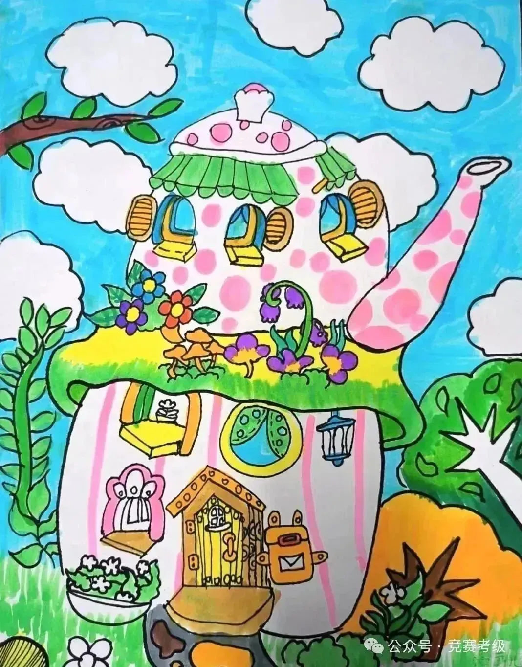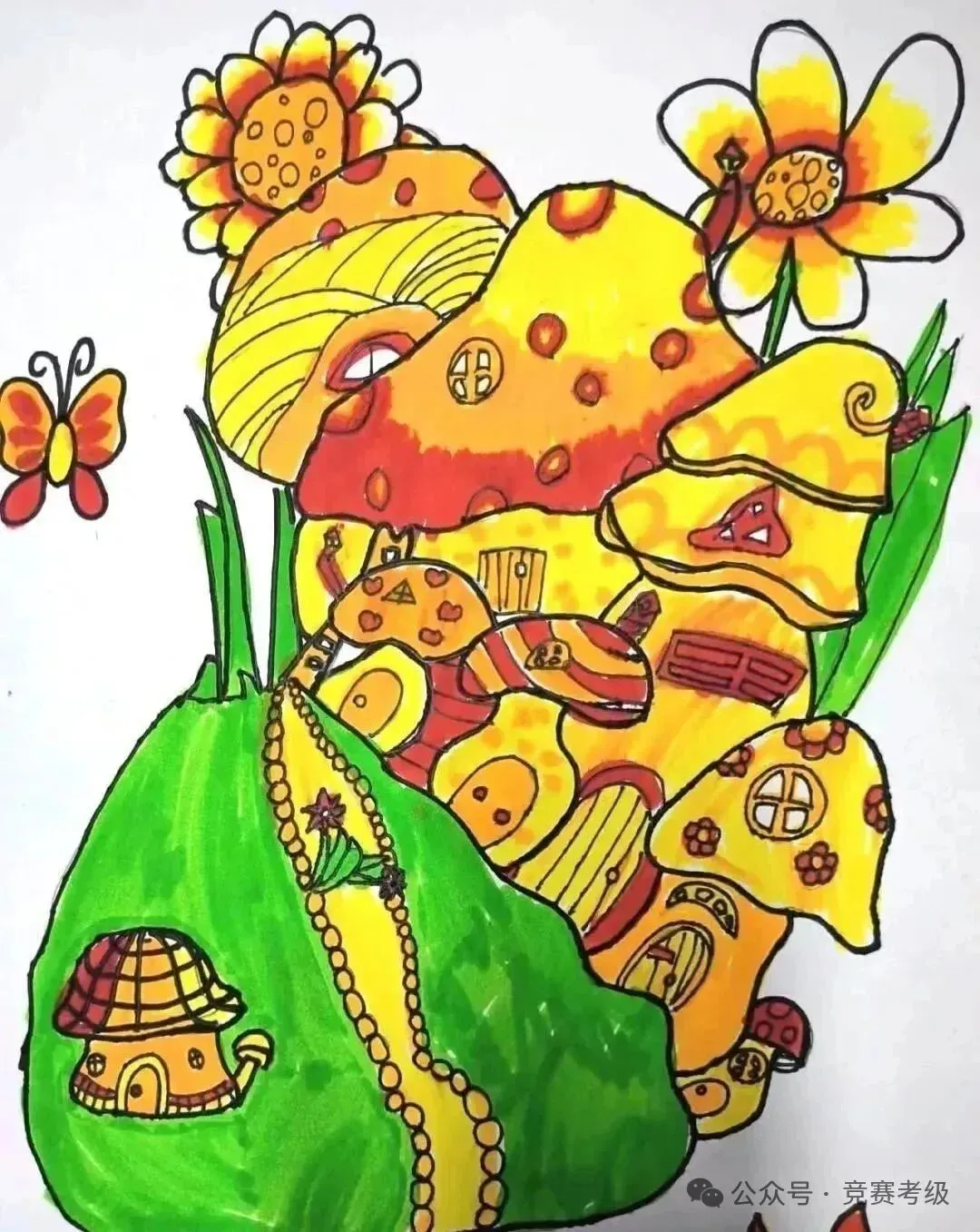 2 级:能运用线条、色彩等元素描绘出具体的形象,形态和构图基本合理,富有童趣。