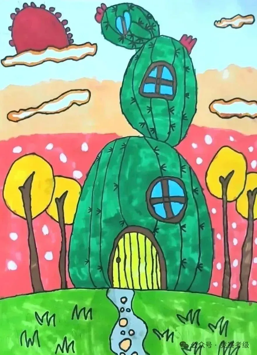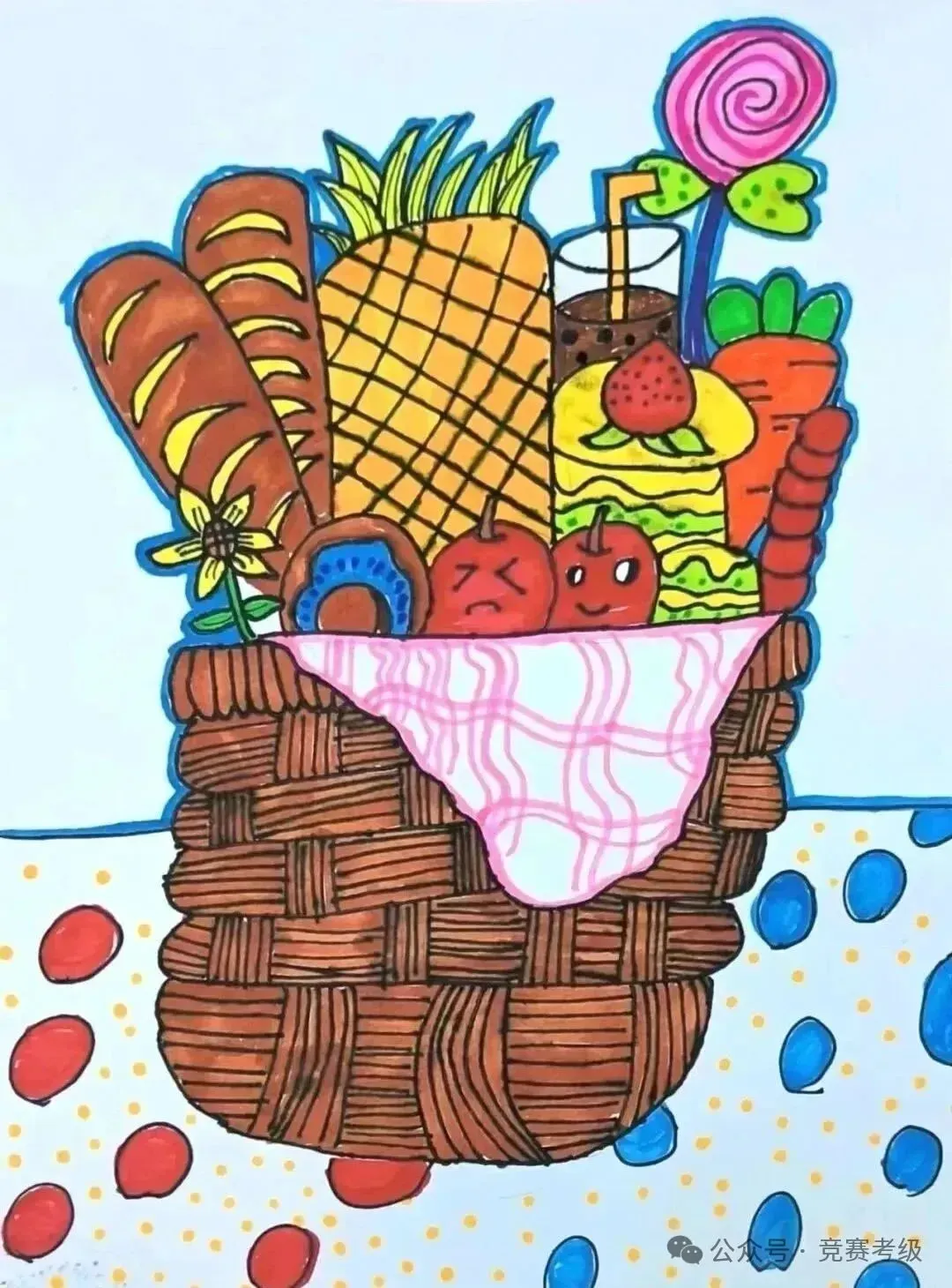 4 级:能运用绘画语言表现画面,构图基本合理,画面基本完整,有内容,具有一定的想象力;色彩基本协调。