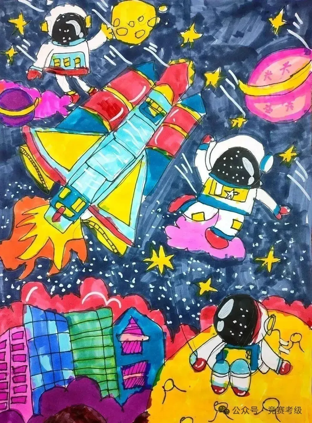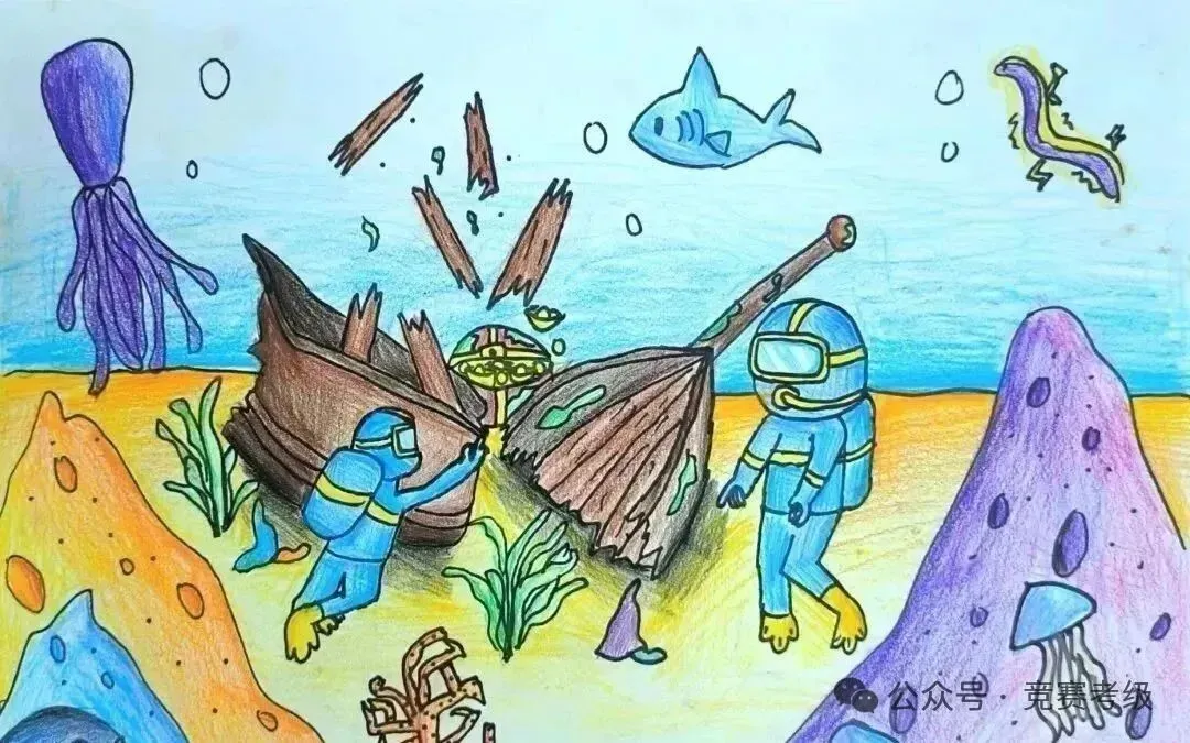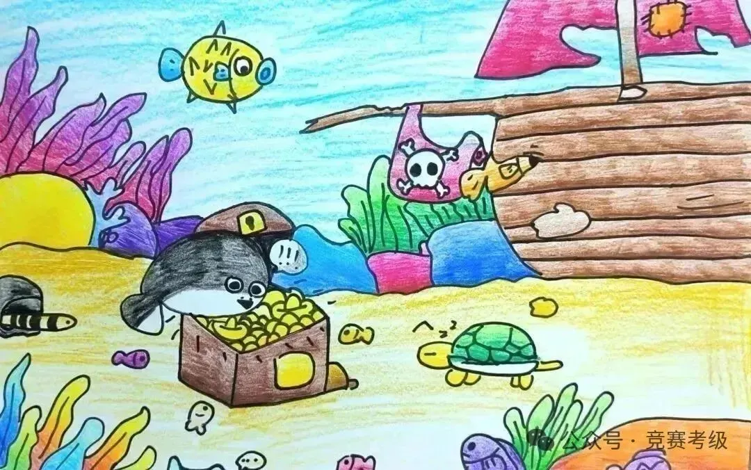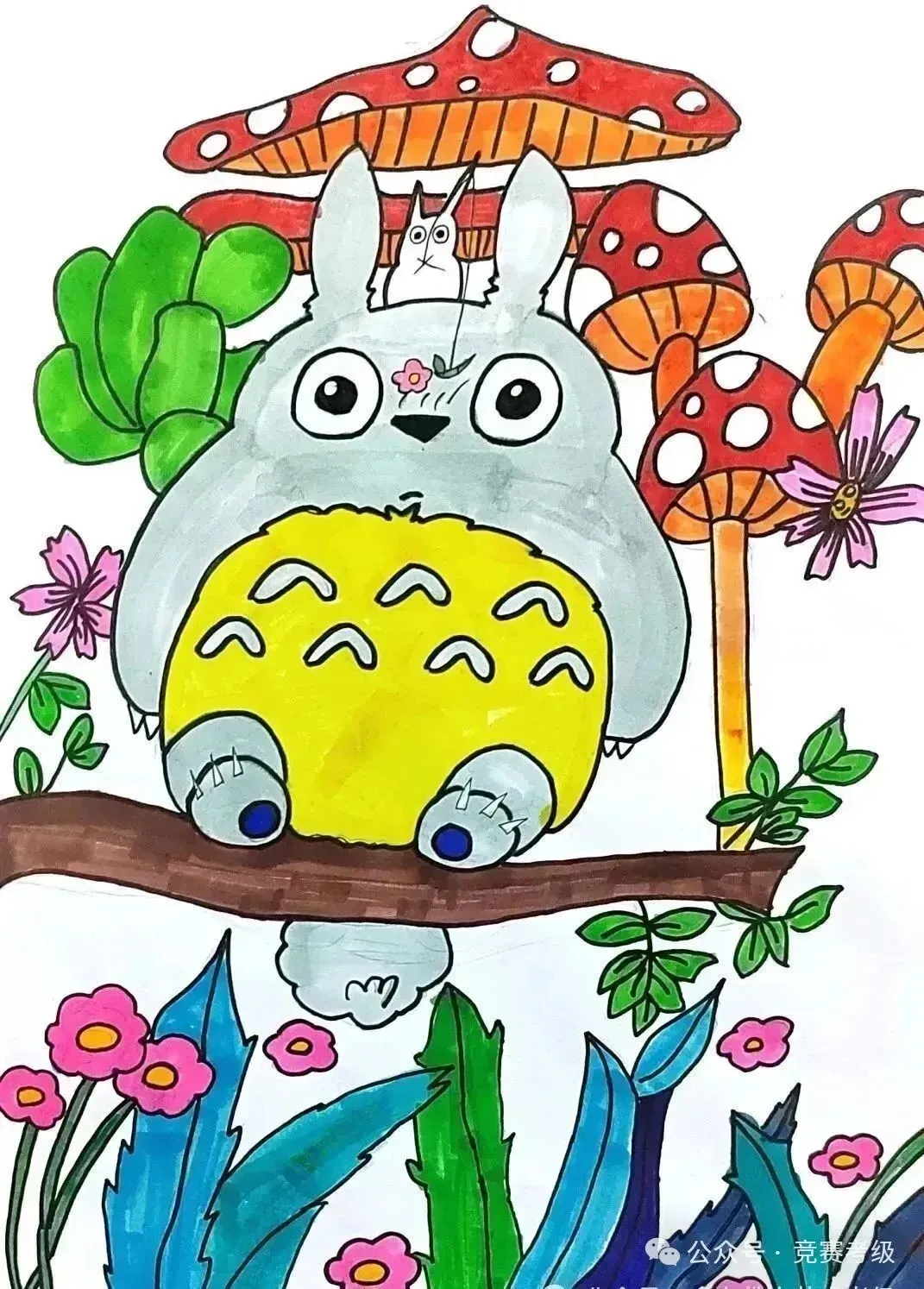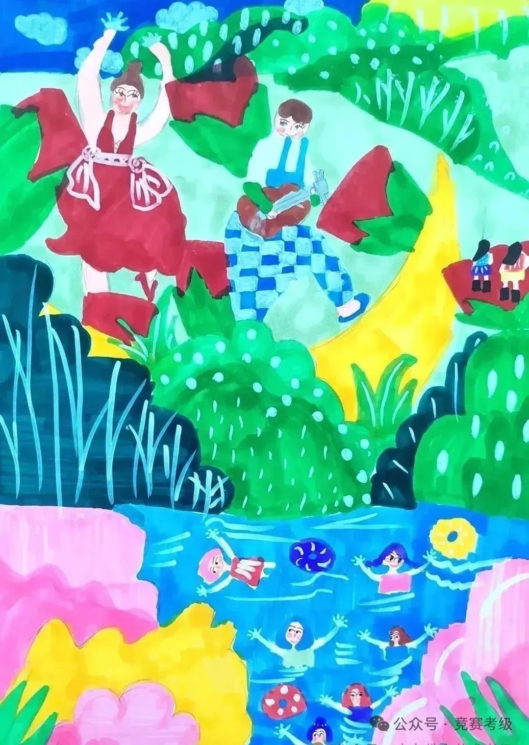 7 级:能合理的运用绘画语言表现画面,主题明确,具有一定的造型能力;画面完整,内容丰富,有想象力;色彩丰富、协调,具有一定的美感和特色。