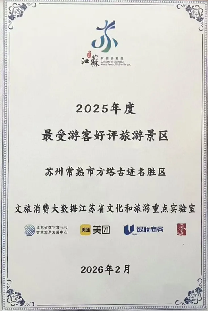 在刚刚落幕的「2026 年一季度文旅经济形势研判交流暨江苏文旅消费大数据 2025 年度成果发布」活动中,方塔园凭借卓越的服务品质与深厚的文化底蕴,从全省 600 余家景区中强势突围,以常熟唯一入选景区的身份荣登 “全省景区最受游客好评 TOP10” 榜单第七名,为我市文旅品牌再添璀璨一笔!