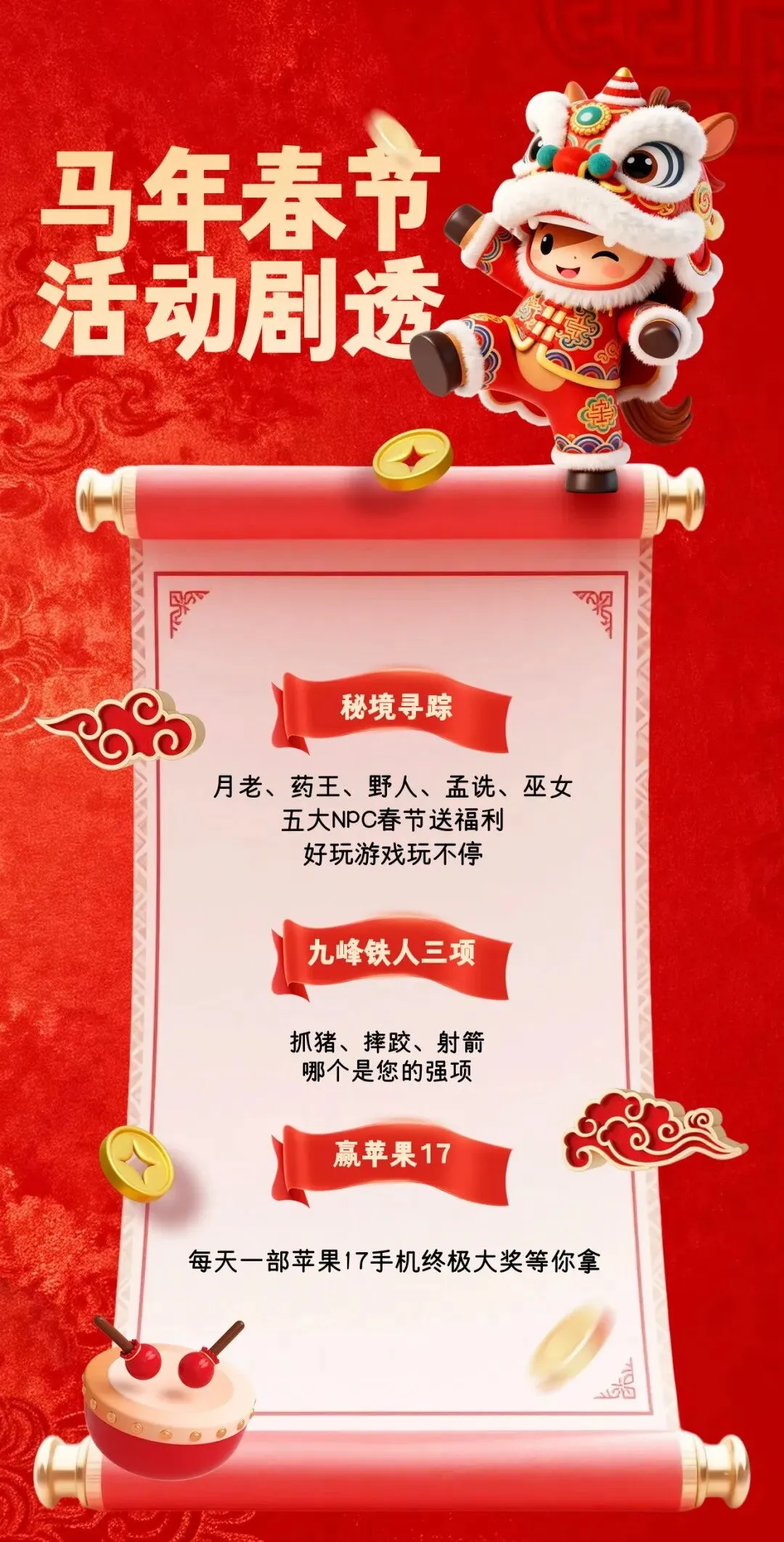 5、初五接财神主题 COS 巡游——《马上有财·滚滚 LIKE》、《五福临门·趣 walk》、《石头剪刀布·开运路》 6、春节祈福主题古装剧系列——《吾皇启新禧·福耀满天下》、《开城迎宾·马上有福》、《看着点·NPC 也疯狂》