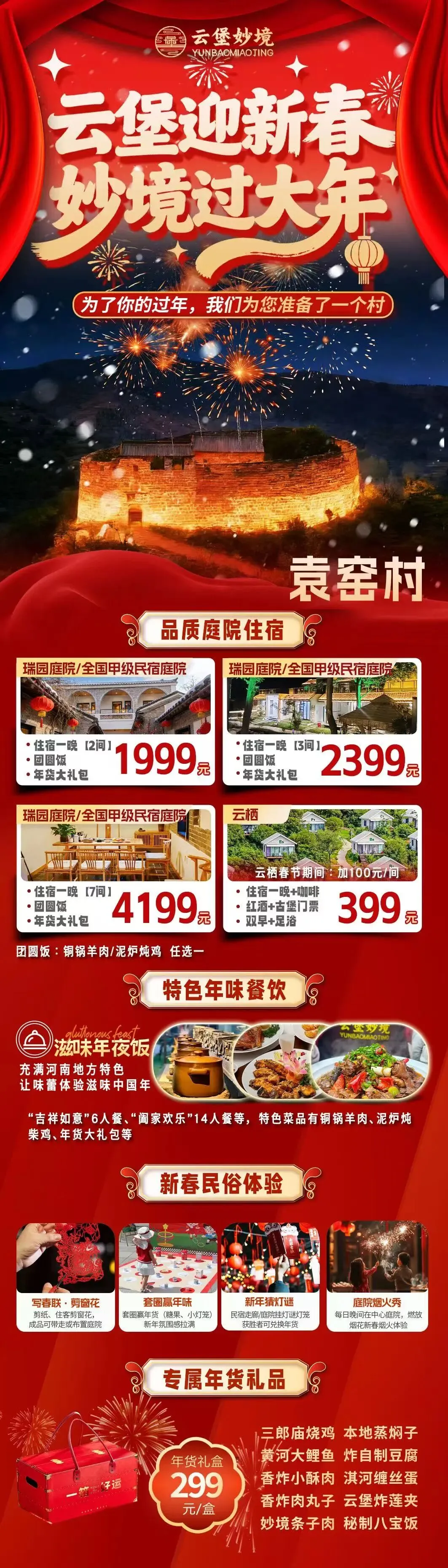 ⏰时间:2026年春节期间 📍地点:云堡妙境集群民宿(汝州市大峪镇袁窑村) 🎫内容: 品质庭院住宿、特色年味餐饮、新春民俗体验、专属年货礼品等