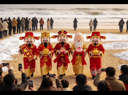 “金滩福运天团”惊喜亮相,福禄寿喜财五大福神NPC身着传统华服巡游打卡。沿途与游客零距离互动合影,现场派送新春糖果与园区优惠券红包,把福气、财气、喜气直接送到手边,沉浸式感受国潮年味。