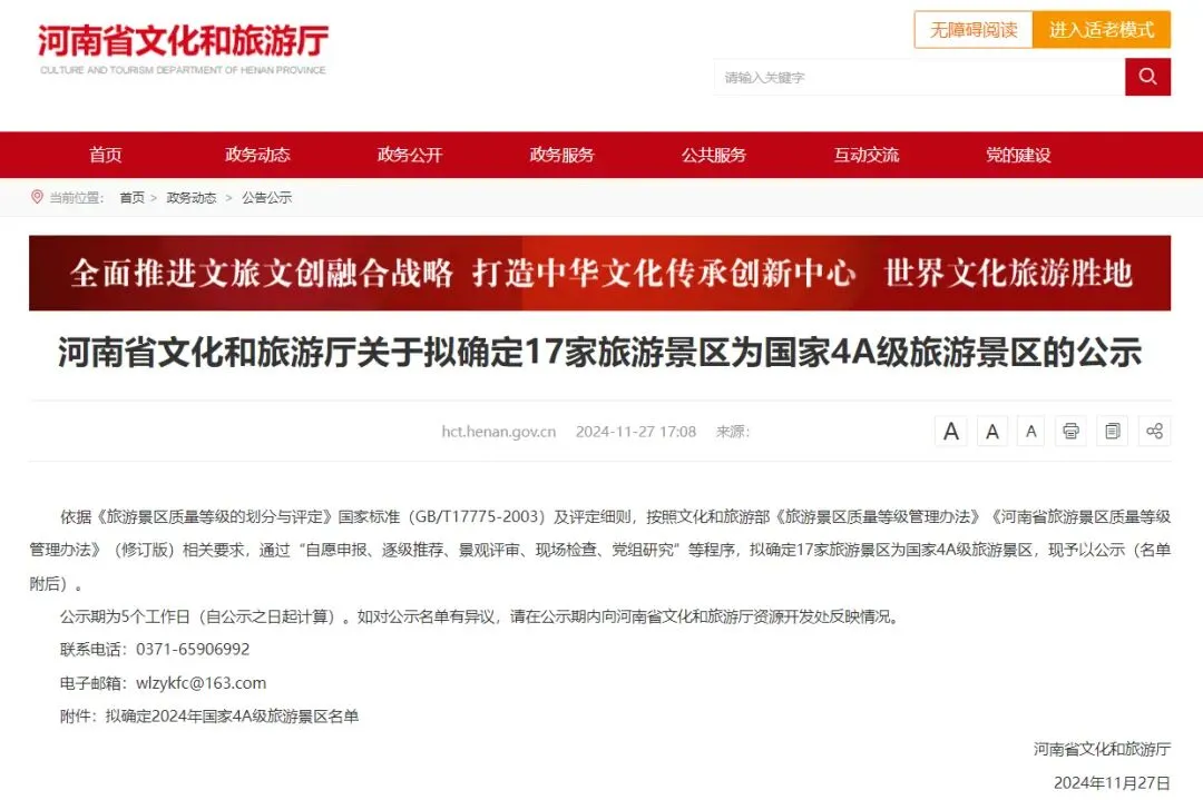 公告显示,依据《旅游景区质量等级的划分与评定》国家标准(GB/T17775-2003)及评定细则,按照文化和旅游部《旅游景区质量等级管理办法》《河南省旅游景区质量等级管理办法》(修订版)相关要求,通过“自愿申报、逐级推荐、景观评审、现场检查、党组研究”等程序,拟确定17家旅游景区为国家4A级旅游景区。