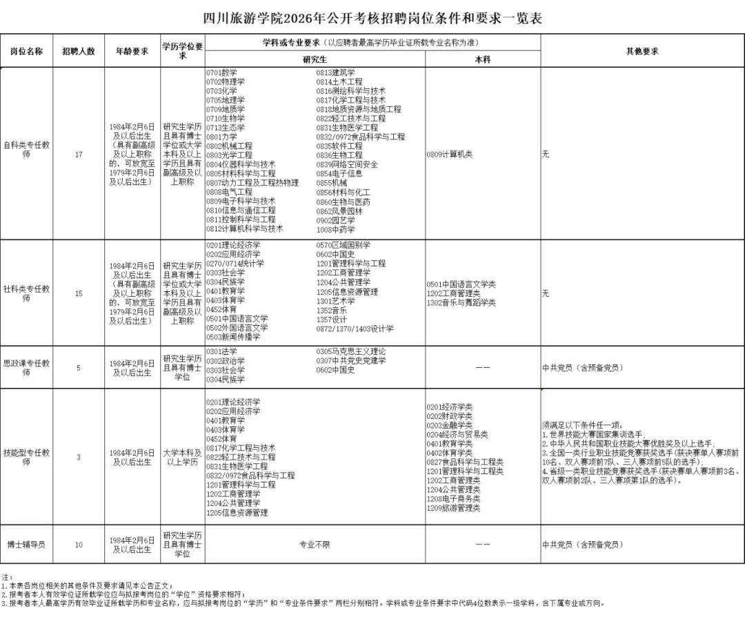 1.四川旅游学院2026年公开考核招聘岗位条件和要求一览表